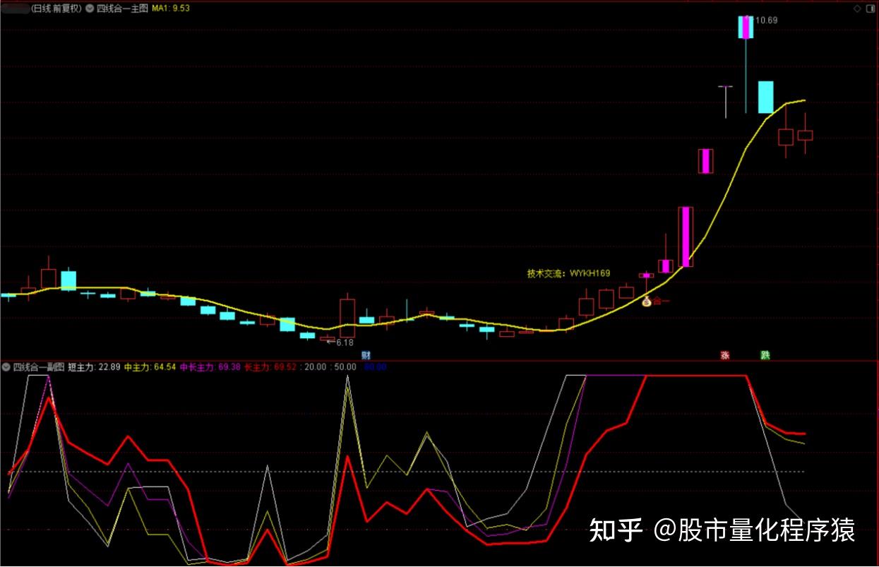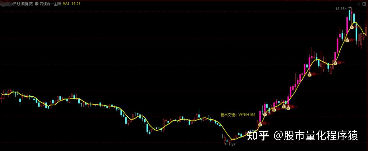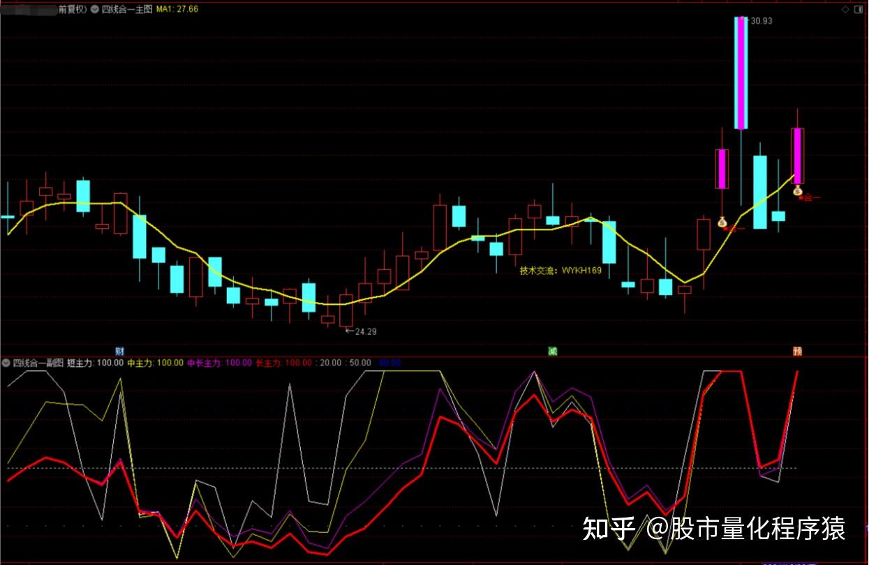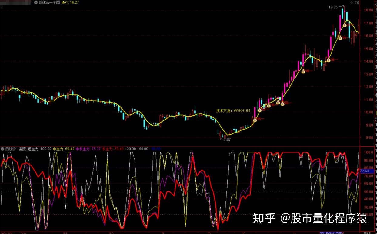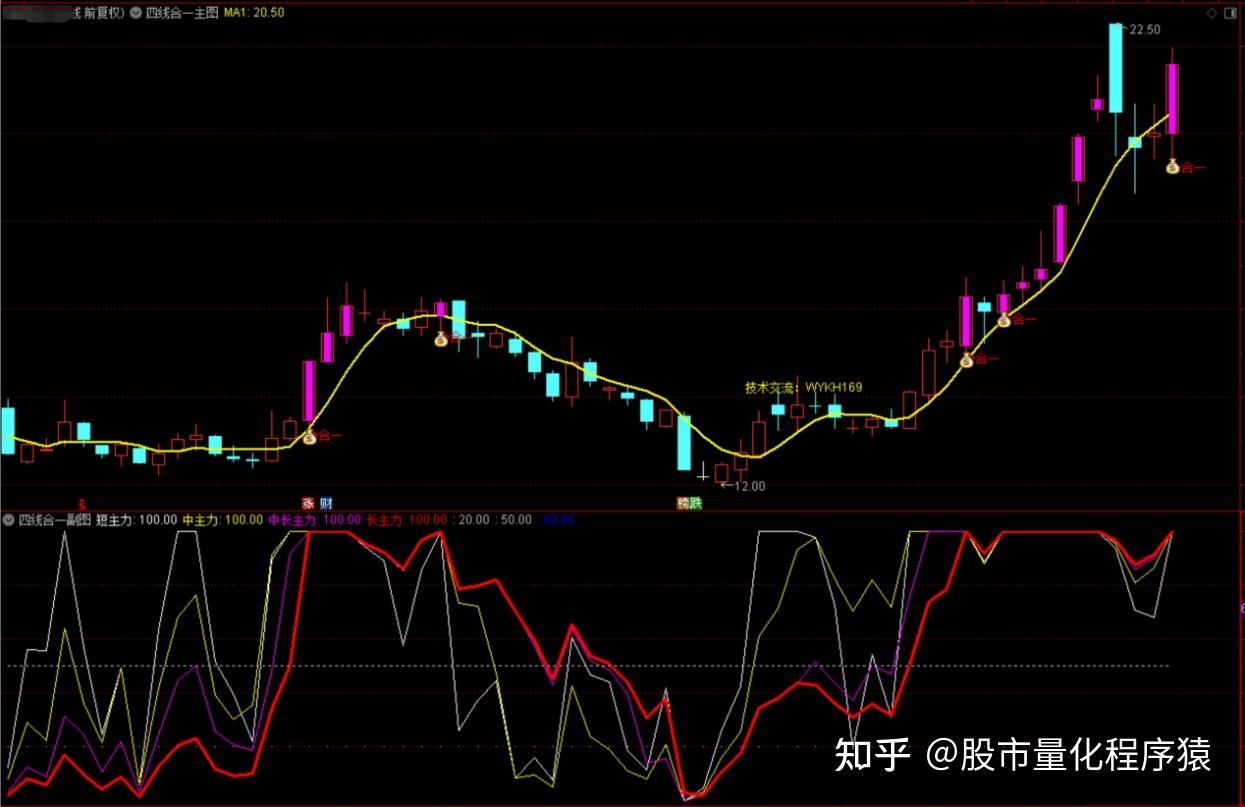 四路合一指标是指幅图中的短期线资金、中期线资金、中长期线资金和长期线资金,合力在一起形成的资金共振信号,它是推动骨价上升的一种指标形式。共振时,在主图中出现”钱袋子”合一信号;此信号可选股;在行情好时,选出的股会比较多,相反时,选出的会比较少。副图四线合一的区域,在对应的主图中显示紫色K线;