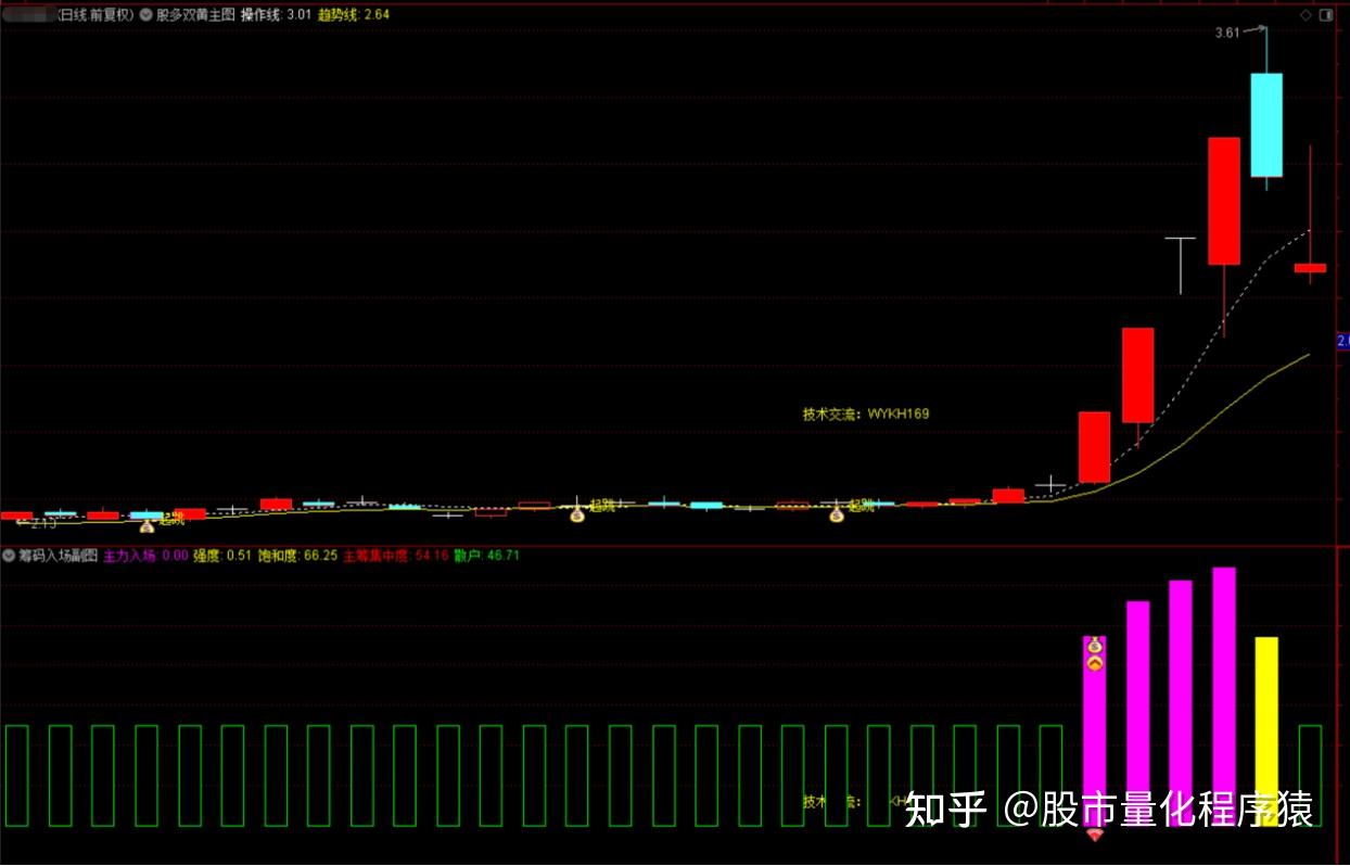 1、”主力筹码入场跟庄擒龙”指标是一款通过独特的算法,实时追踪并分析散户与主力资金的筹码分布情况。在指标显示中,绿色柱代表散户的筹码,而紫色柱则代表主力筹码,也是主力资金的入场情况。随着市场资金的流动和筹码的转移,紫色柱子会相应地发生变化,从而反映出市场的真实动态。