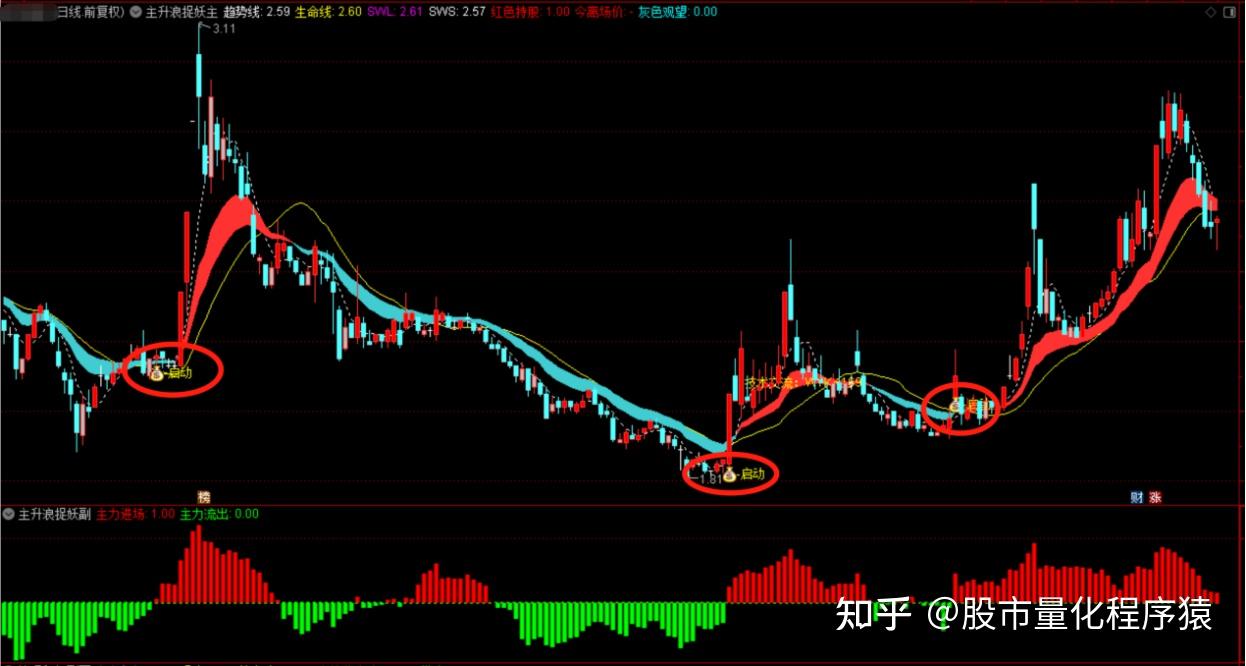 1、股友们应密切关注主图和幅图中的信号变化。当同时出现”红色K线+红色资金流入柱子+股价站上趋势线”之上时,出现“钱袋子”主升浪启动信号的出现。