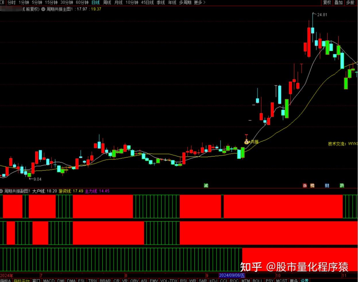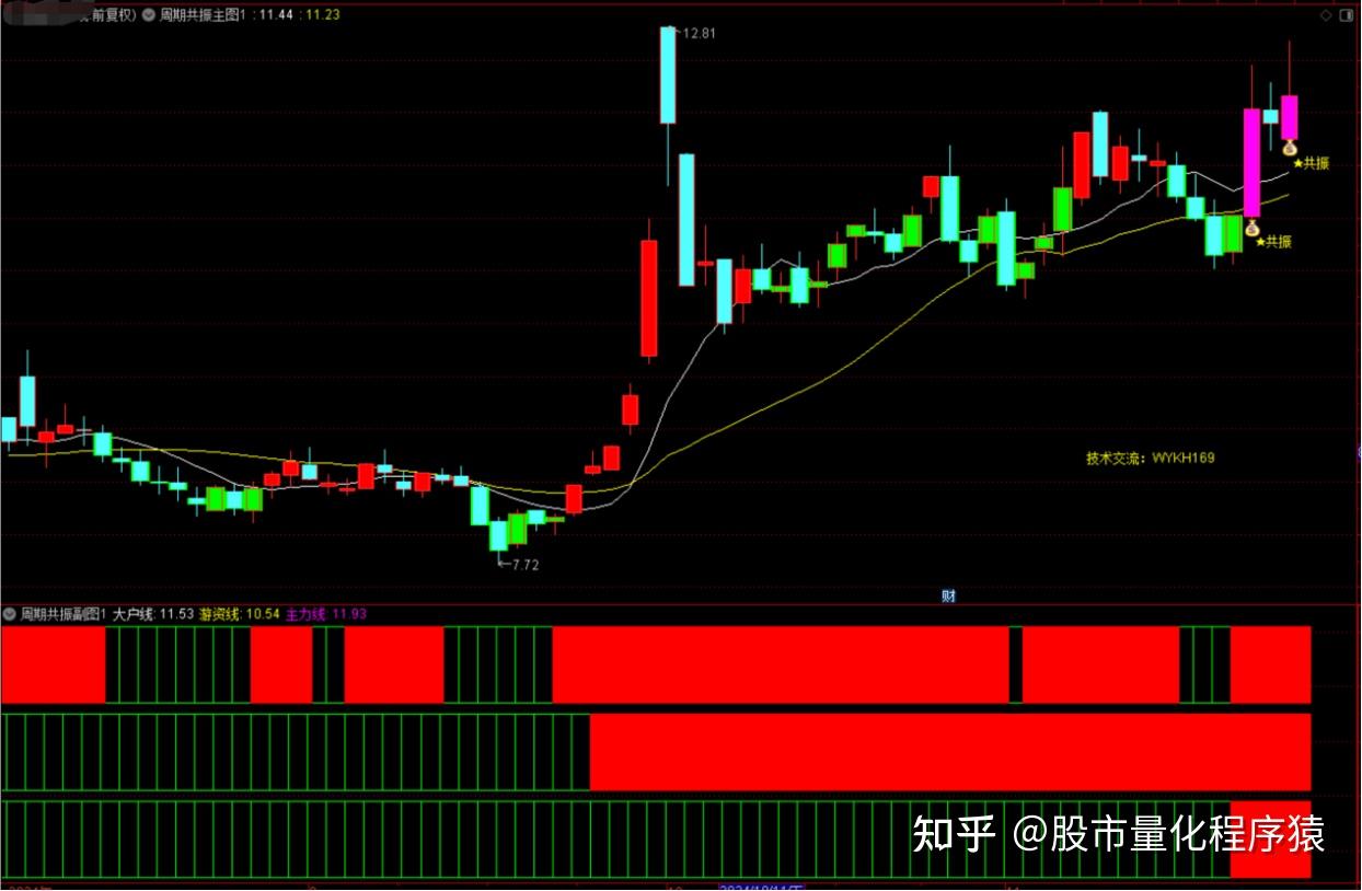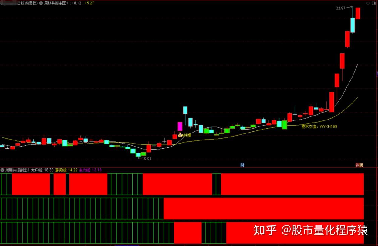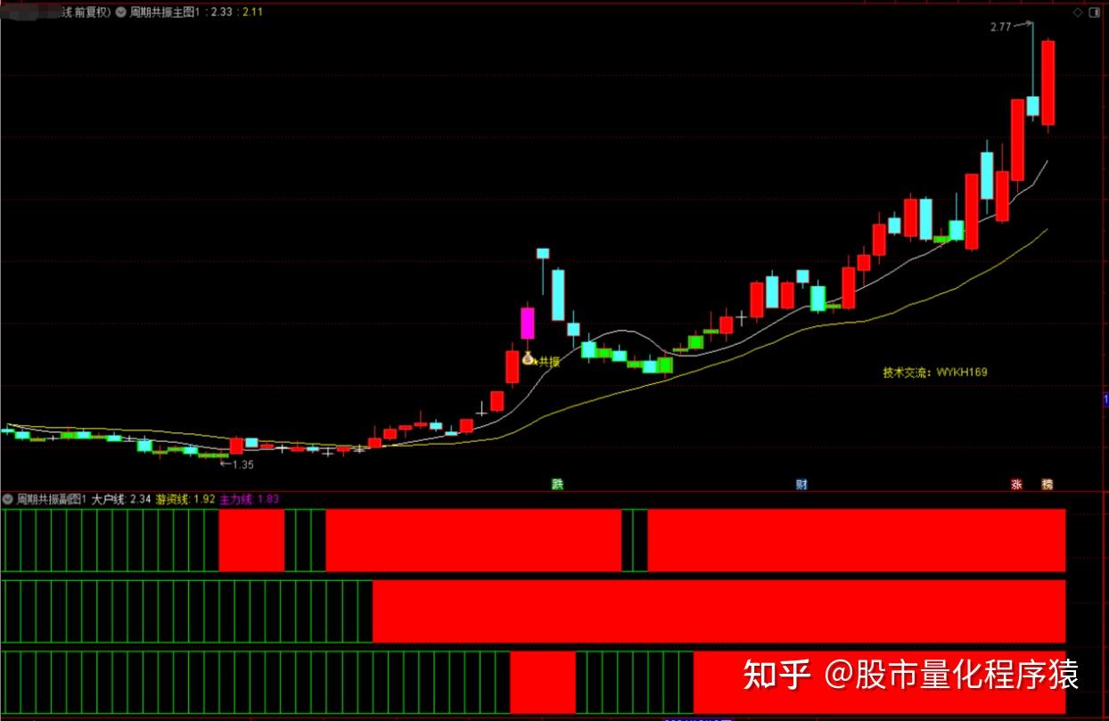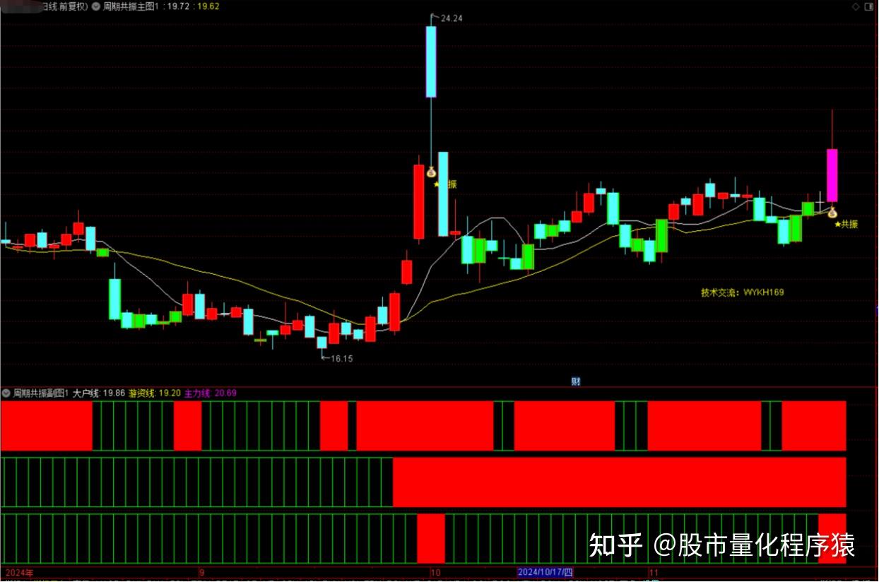 2、在幅图中,当日、周、月三条线同时呈现红色时,形成三线共振信号,表示个股在多时间周期上均处于上涨趋势中,此时若主图也呈现红色K线,则发出“钱袋子”共振信号,这是极佳的选股与买入时机。