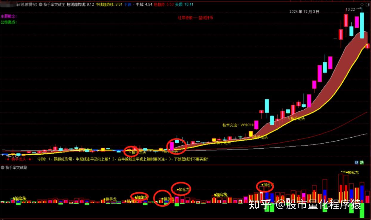 主副图出现换手龙共振为确定性的买点。