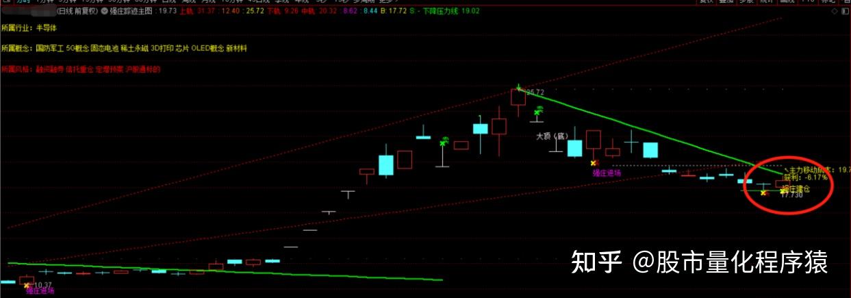 DRAWTEXT(跟庄踪迹1C AND COUNT(跟庄踪迹1C,30)=1,LOW*0.95,'大顶(底)') COLORWHITE;