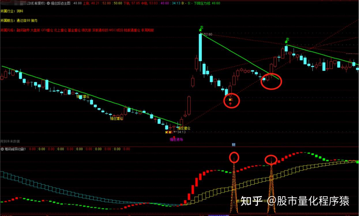 副图指标说明:用于监控主力筹码、主力资金等主力行为,三角尖出现表示主力吸筹,黄色柱角度越大表示主力资金吸筹量越大。与红绿K波动高低配合,筛选买点。