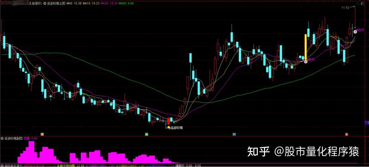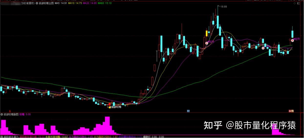 底部吸筹与拉升信号指标是一种识别个股的底部吸筹阶段以及随后的拉升信号。该指标结合了价格、成交量、均线以及特定计算公式的综合应用。