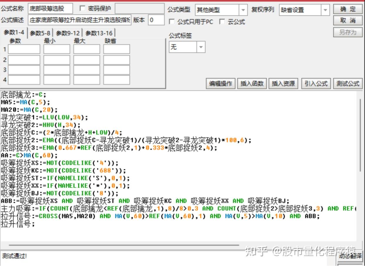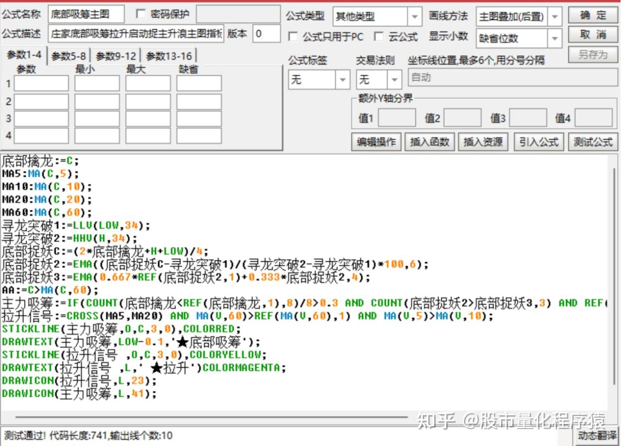 1、通过计算34日内的最低价和最高价,以及某日的均价,构建出一个用于判断底部吸筹的指标。