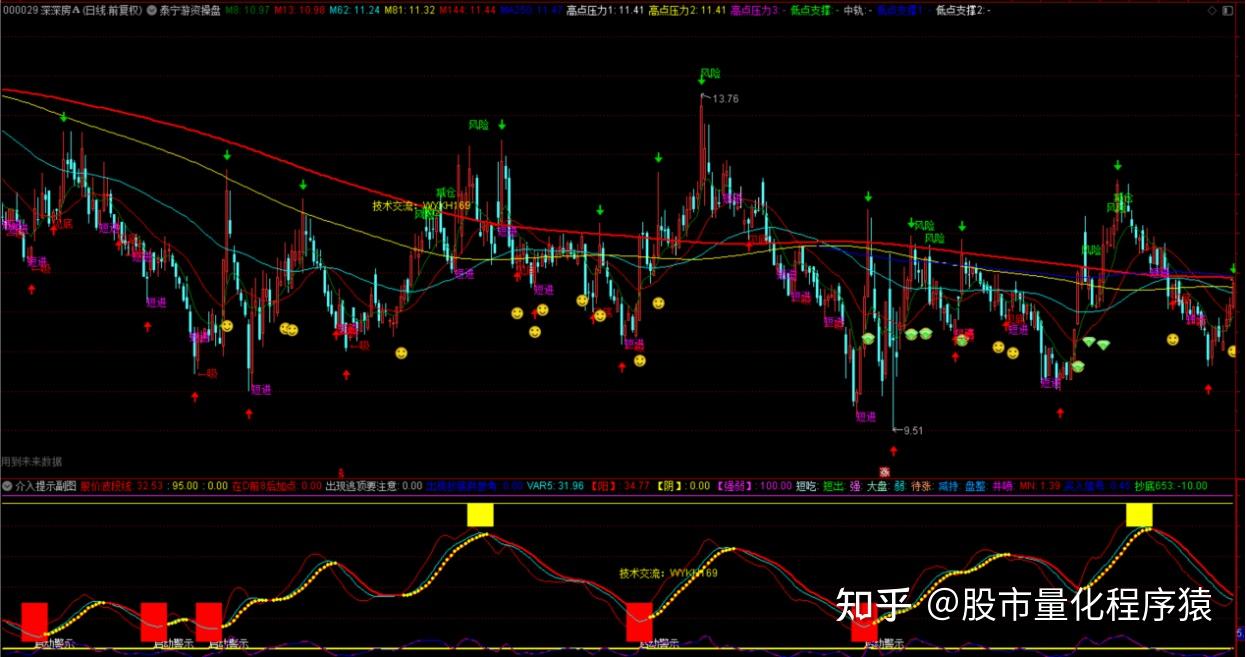 D2:=REF(D1,1);DRAWTEXT_FIX(C>O,0.5,0.4,0,'技术交流:WYKH169'),COLORYELLOW;