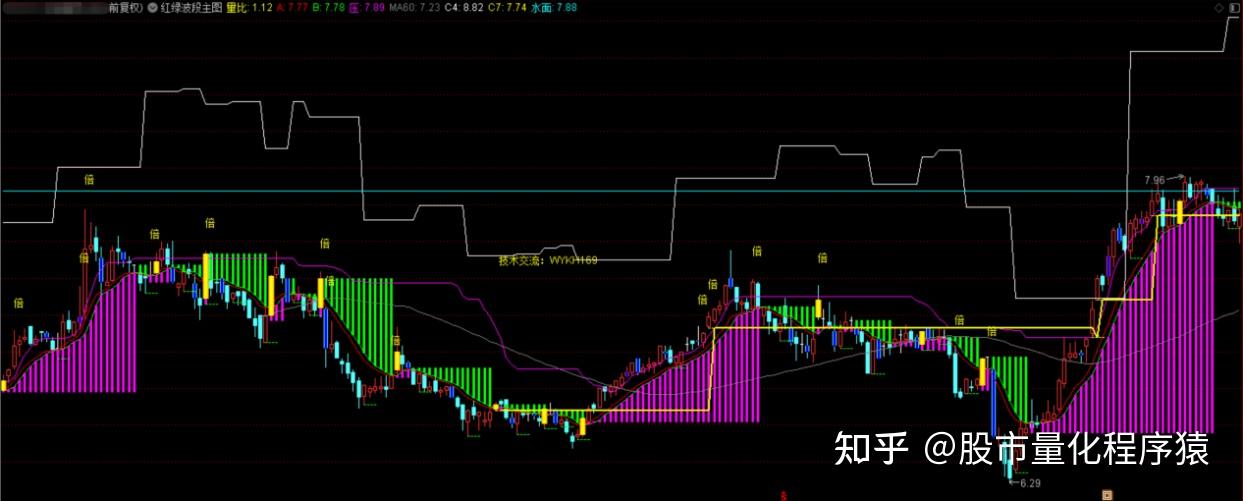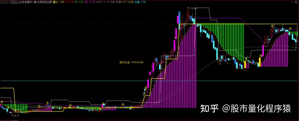 STICKLINE(A<B,B,E,0.1,0)COLORGREEN;DRAWTEXT_FIX(C>O,0.4,0.5,0,'技术交流:WYKH169'),COLORYELLOW;