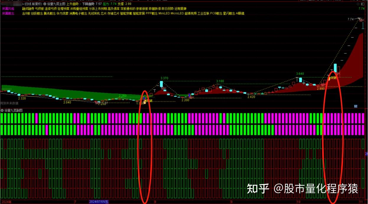 起爆点:CLOSE>K线突破1 AND CLOSE>K线突破11 AND K线突破15>1.8 AND COUNT(CLOSE>K线突破1 AND CLOSE>K线突破11 AND K线突破15>1.8,7)=1;
