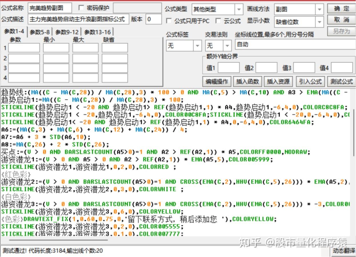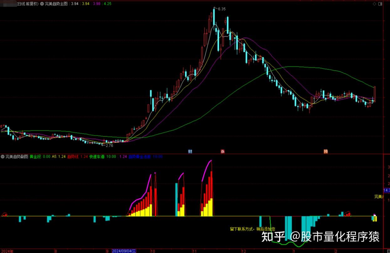 黄金段:=IF(MA((C - MA(C,28)) / MA(C,28),3) * 100 < -15,MA((C - MA(C,28)) / MA(C,28),3) * 100,0) * A4,LINETHICK2,COLOR00F600;A5:=IF(MA((C - MA(C,28)) / MA(C,28),3) * 100 > 0 AND MA(C,5) > MA(C,10) AND A3 > EMA(MA((C - MA(C,28)) / MA(C,28),3) * 100,5) AND A2 > REF(A2,1),MA((C - MA(C,28)) / MA(C,28),3) * 100,0) * A4;