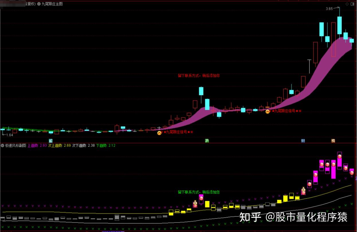 根据趋势强度级别判断,当趋势强度达4级时,于高位触发洋红色柱子,(突破预警);首次出现4级时叠加”钱袋子”标志(启动信号)。