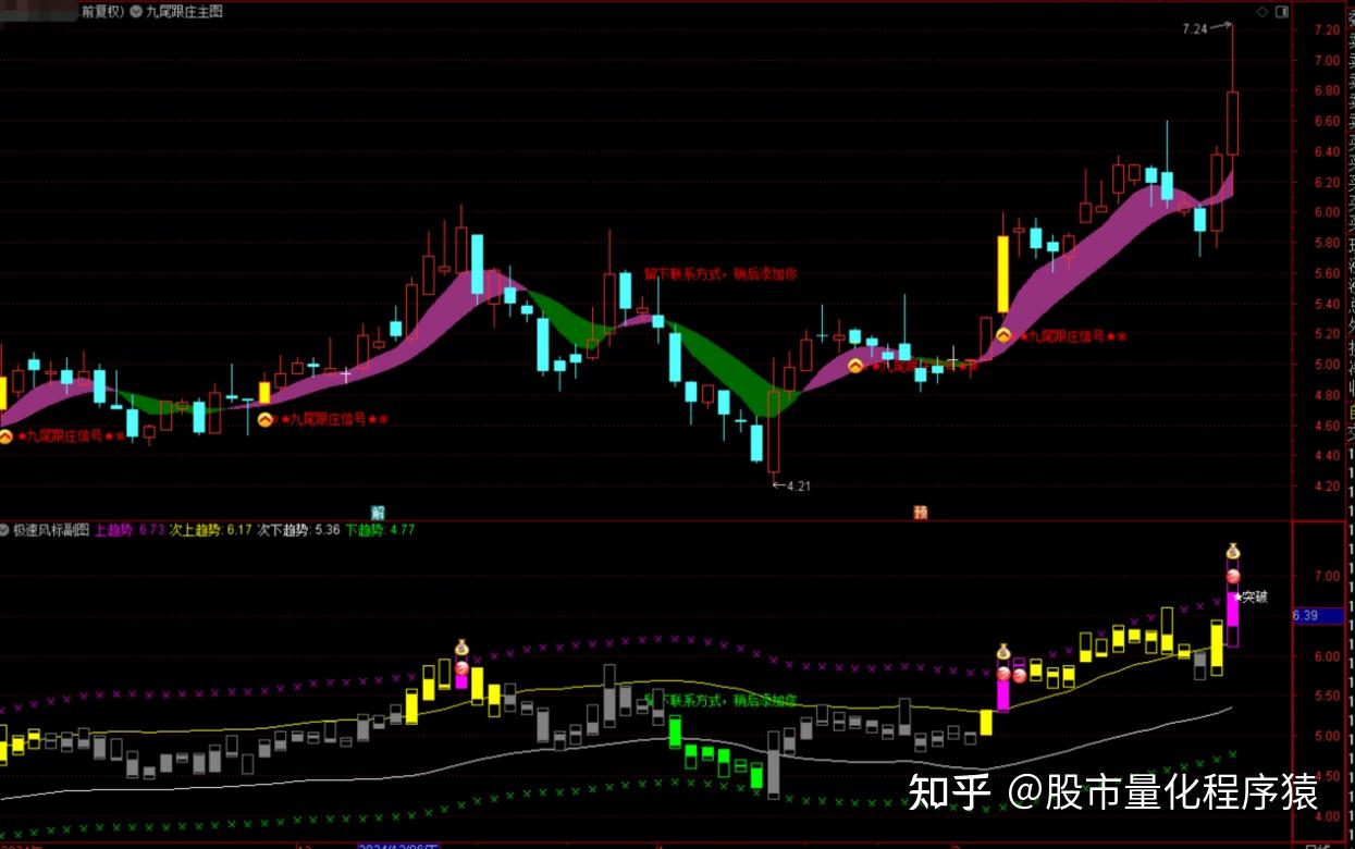 根据趋势强度级别判断,当趋势强度达4级时,于高位触发洋红色柱子,(突破预警);首次出现4级时叠加”钱袋子“标志(启动信号)。适配高频交易场景下的快速响应特性,可对市场风向的敏锐捕捉,适于短线交易参考。