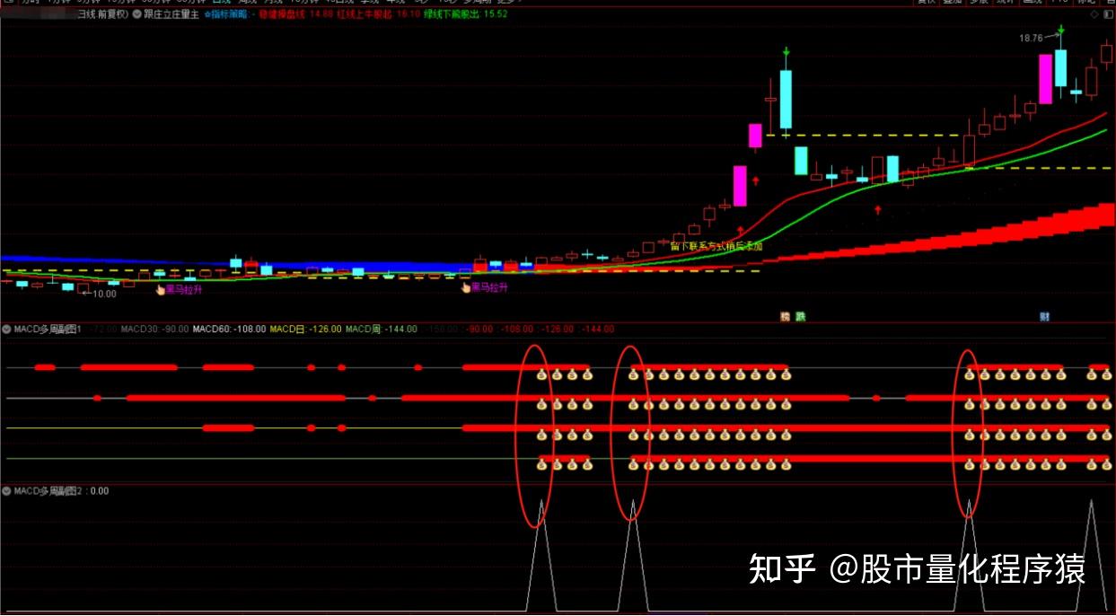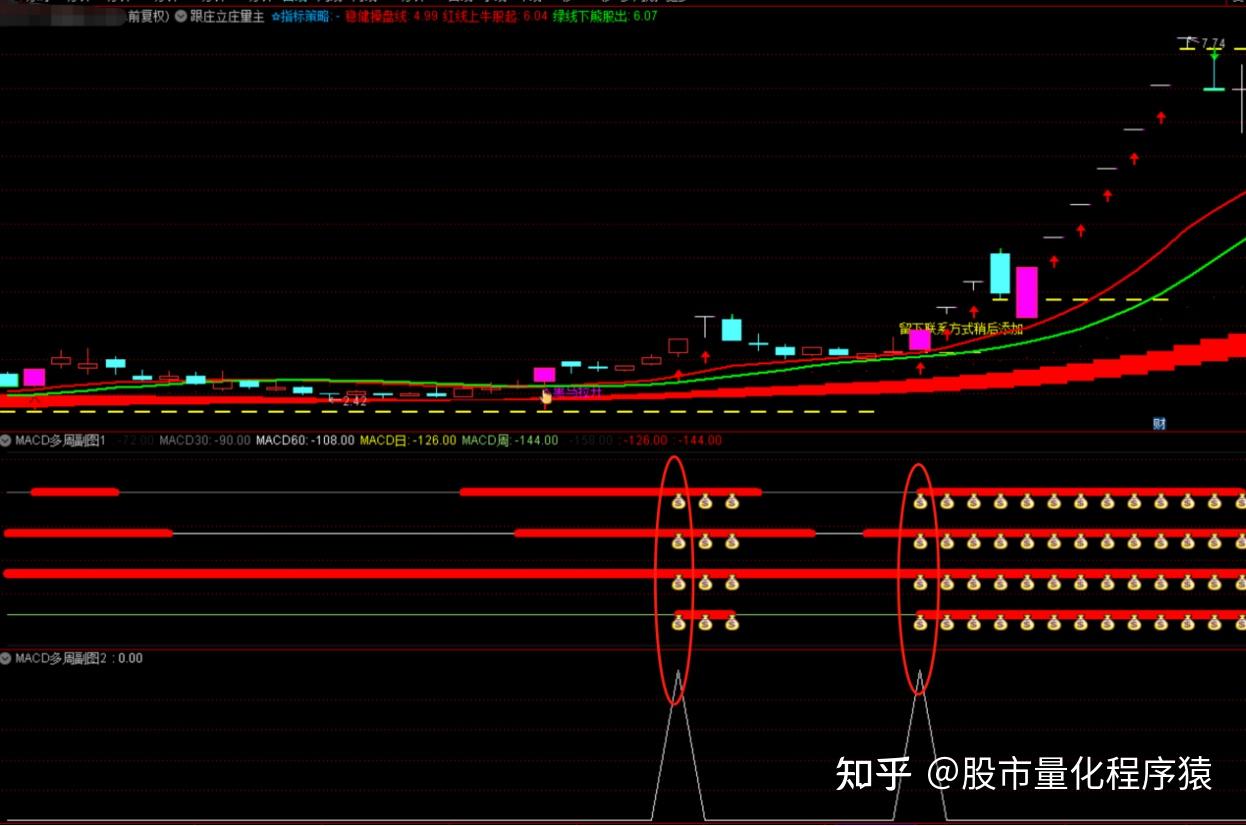 MACD多周期指标简介:本指标基于经典MACD算法改良开发,创新性实现30分钟、60分钟、日线、周线四个时间周期同屏联动分析。通过多维度信号共振机制,精准捕捉市场趋势拐点与主力资金动向,特别适用于捕捉大级别行情启动信号。当四个周期MACD指标同时发出买入信号时,形成”红色共振粗线+钱袋子“复合信号,标志着极强多头能量的集中释放。