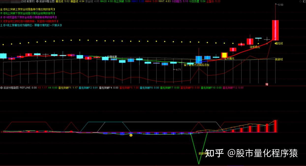 潜龙突破Z1:=(LOW+前高突破+捉妖筹码*2)/4;潜龙突破Z2:=MA(潜龙突破Z1,4);