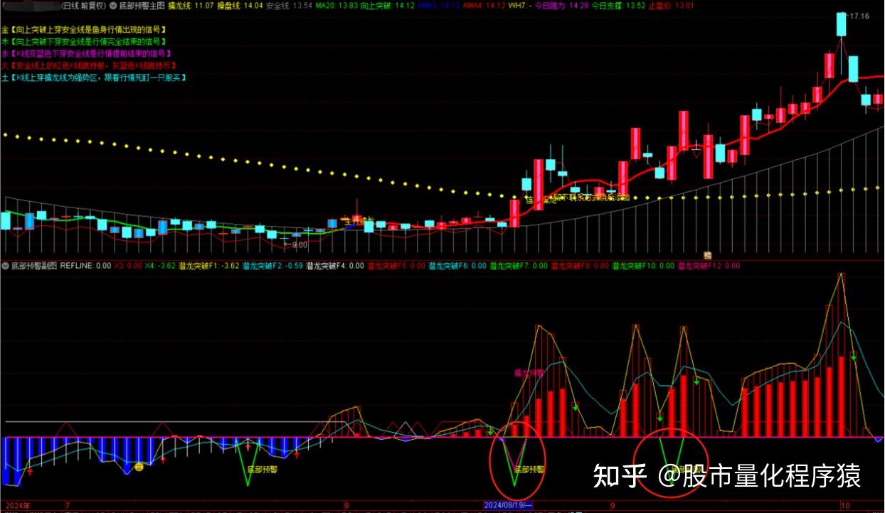 潜龙突破F12:IF(潜龙突破F11,-2,0),COLORLIMAGENTA,LINETHICK2;DRAWTEXT(潜龙突破F11,4,'擒龙预警'),COLORLIMAGENTA;