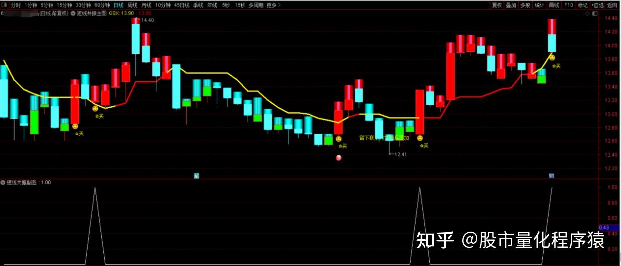 3、红牛区K线为红色时持股,蓝线转绿时立即卖出;首次突破平衡线+红K时,显示”笑脸”图标”买”信号,此时平衡线需呈上升趋势且股价站稳(呈红色线),增强买入确定性。