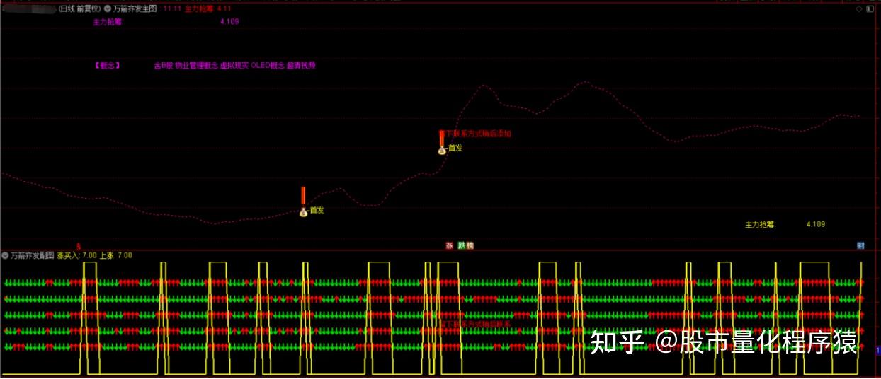 上涨:IF(章鱼指标 AND 鱼哥 AND 鱼哥1 AND 鱼哥2 AND 鱼哥3 AND 鱼哥6,7,0),COLORYELLOW,LINETHICK2;