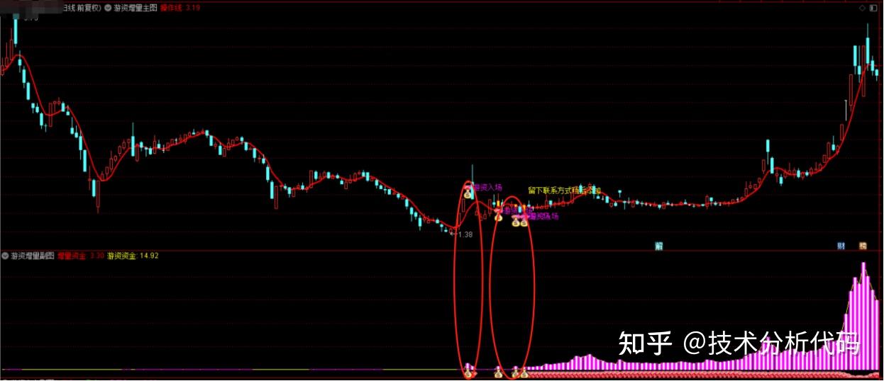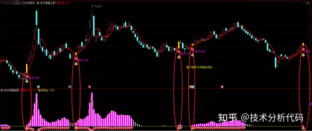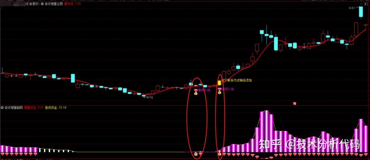 -双资金共振信号:当增量资金与游资资金同步放大时,主图自动生成紫色柱体(增量资金)叠加白色柱体(游资资金),并伴随“钱袋子”图标,提示游资联合进场信号。