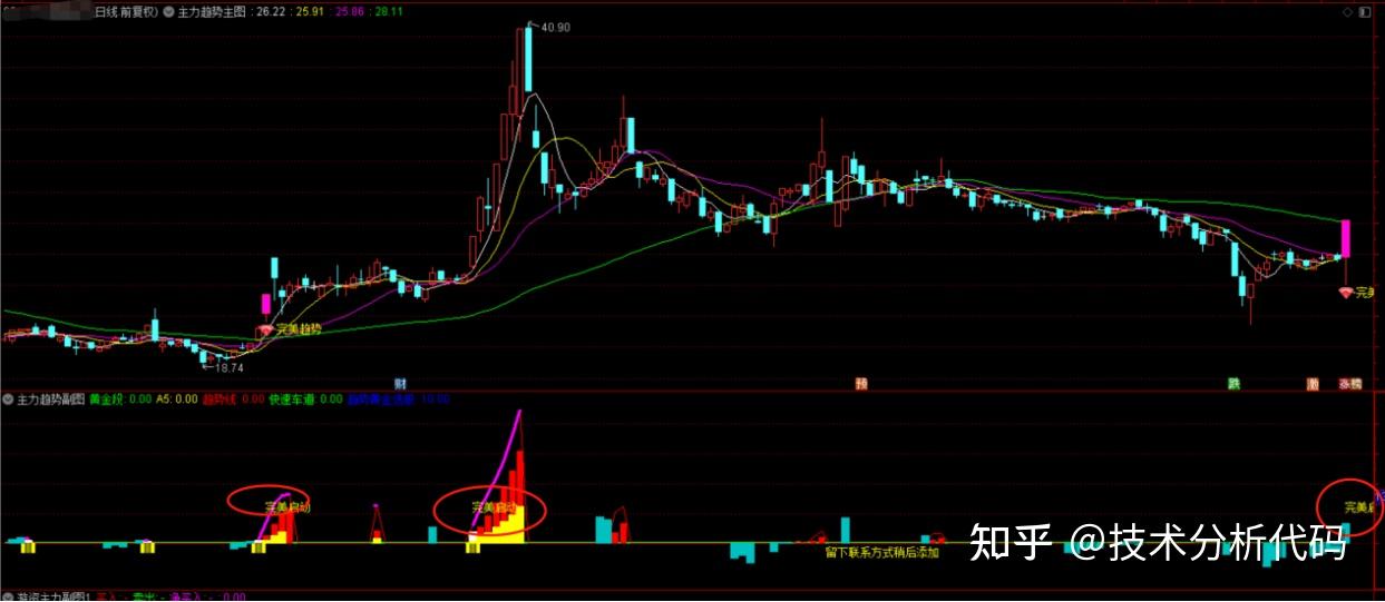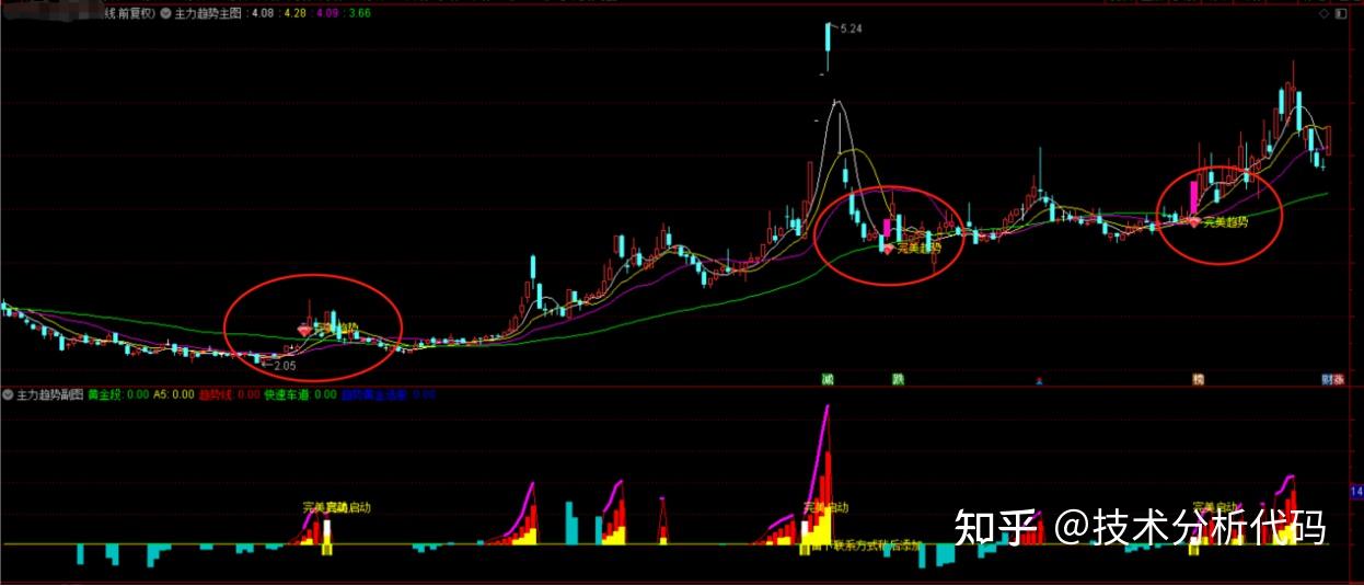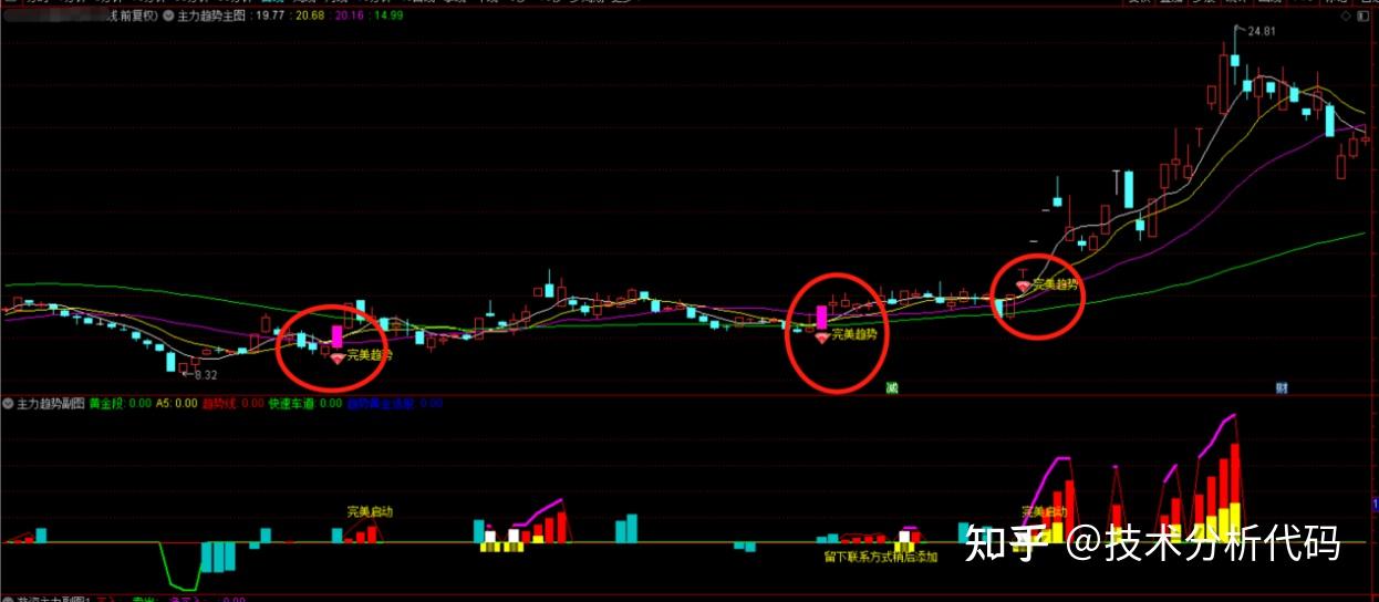 指标用法:主图完美趋势,大阳线加上均线多头排列,副图完美启动加上量柱放大,趋势共振启动点出现。
