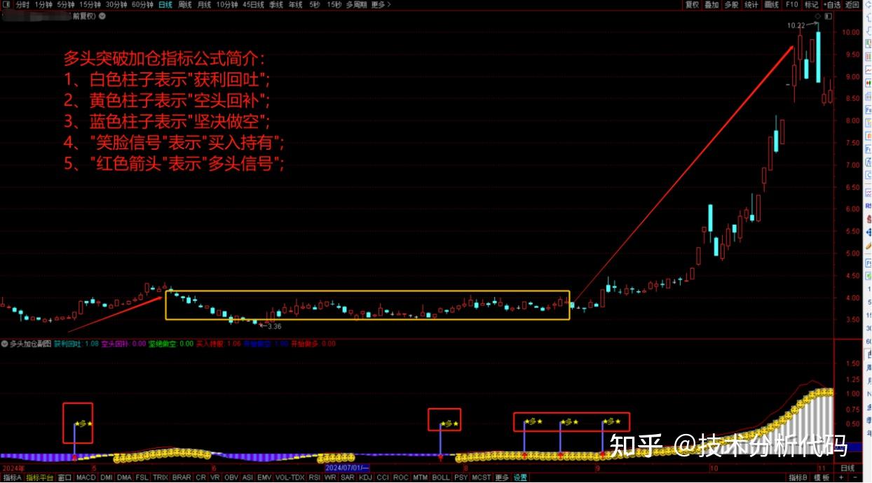 DRAWTEXT(开始做多 AND 成本突破3 AND XG,买入持股+0.5,'★多★'),COLORYELLOW ,LINETHICK2;