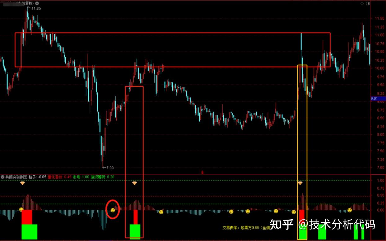 在指标简介中,我们强调要综合分析技术指标,图中竖红矩形处,出现了红+绿柱,我们应该加强关注,但是股价之前呈现V形反转之后,接近前期一个小平台附近,因此具有一定的压力,后面在完全触及小平台顶部之后出现了回落,因此此次信号的空间比较有限。