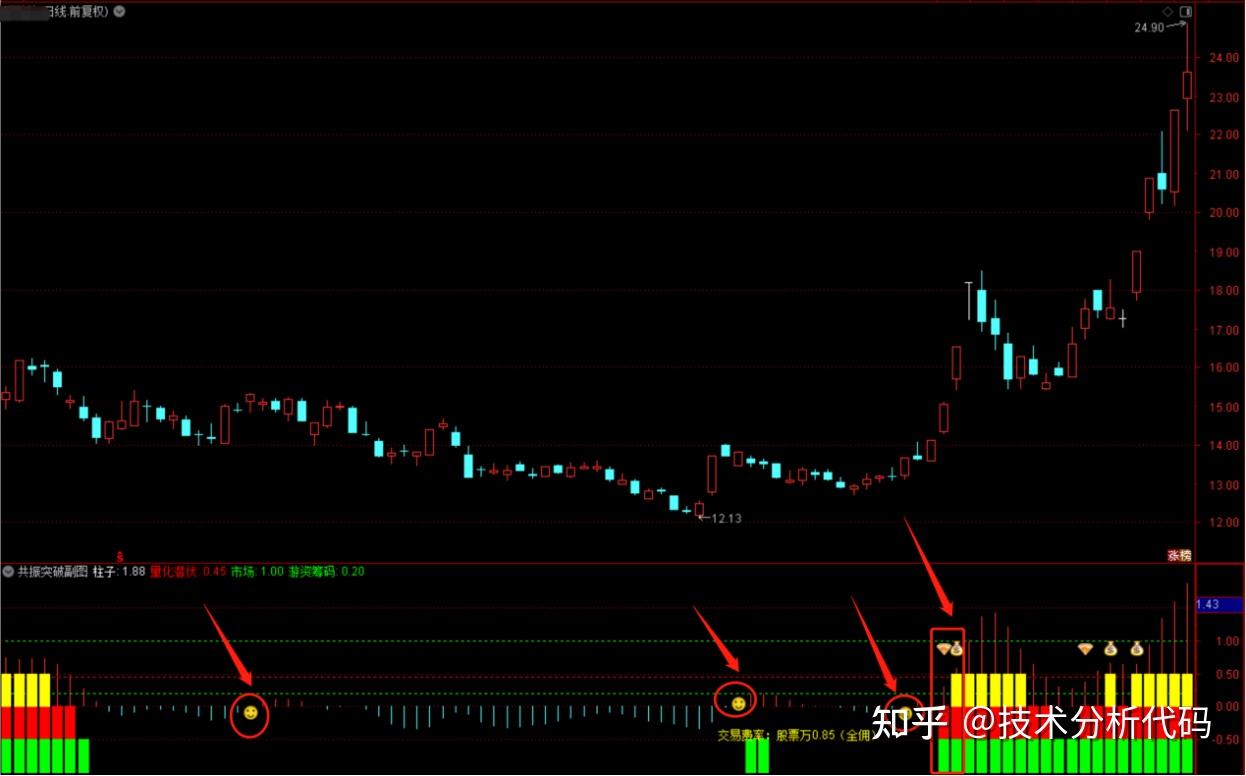 上图中,我们看见出现了多次笑脸,更具指标简介,出现了笑脸的信号我们可低吸关注,但是第1个、第2个笑脸出现在下降趋势中,第3个笑脸出现在可能趋势发生逆转的地方,因此,我们应该对第三个笑脸予以重点关注,随后,我们副图指标中出现了绿柱+红柱、黄柱+红柱+绿柱,根据指简介,出现绿柱+红柱时加强关注,出现黄柱+红柱+绿柱重点关注,之后股价从13元左右,上涨至24元,几乎拉升了1倍左右。