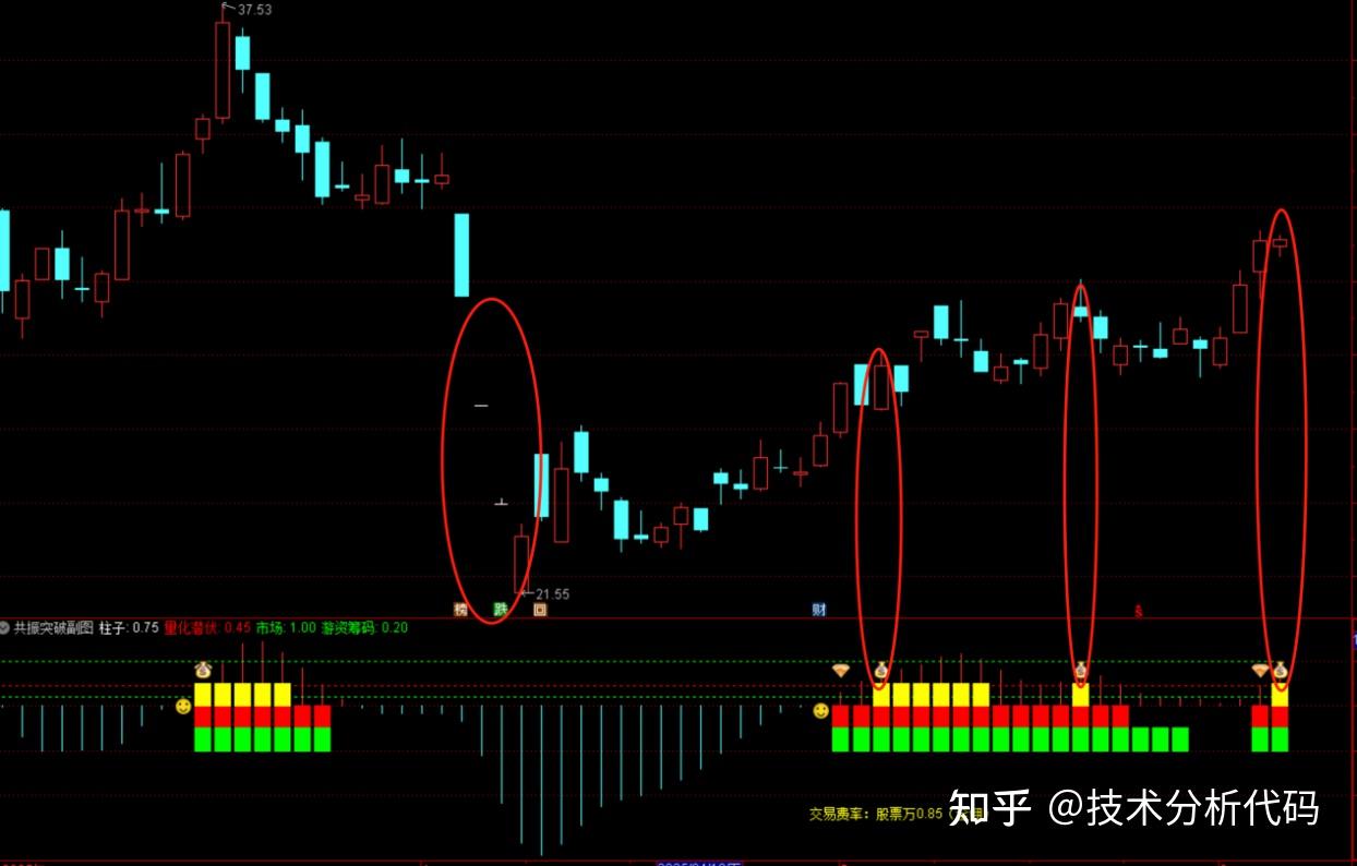 上图中首先出现了笑脸信号,予以关注,后面出现了红柱+绿柱组合予以加强关注,如果后续在出现黄柱+红柱+绿柱应予以重点关注。