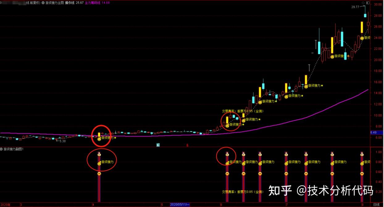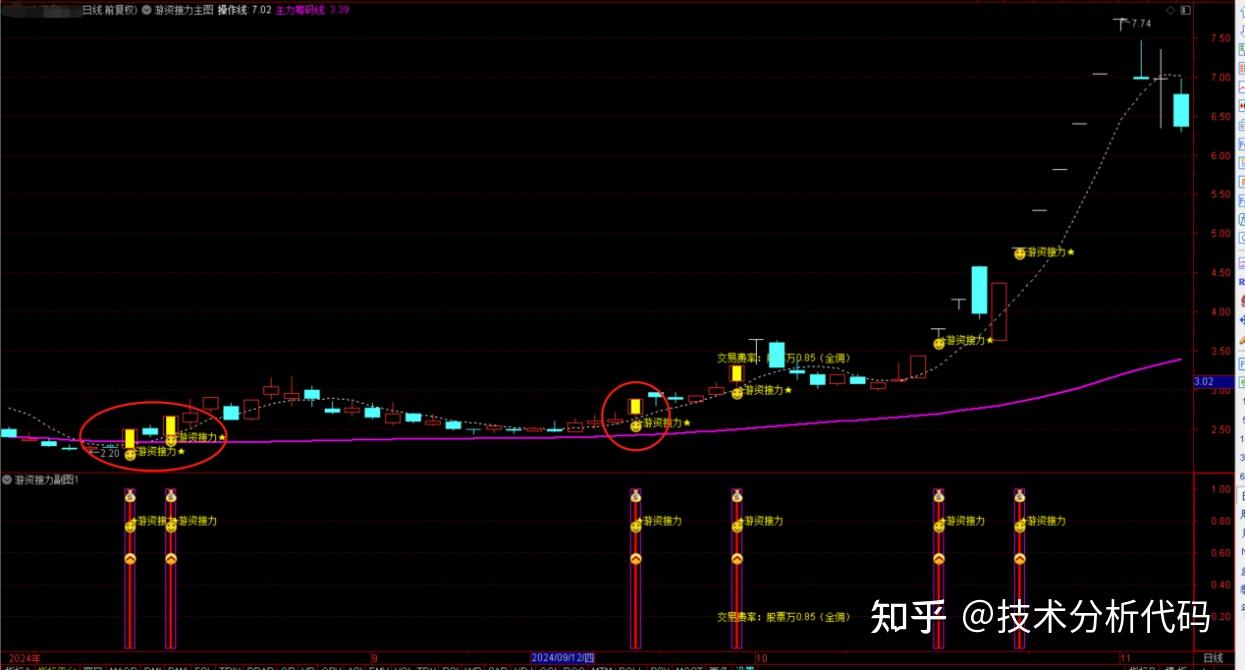 上图中,第1次出现信号的时候,股价也时没有站上主力筹码线,因此上升空间并不大,但是后续出现信号之前,股价已经完成一段时间的洗筹,并且始终处于主力筹码线上方,随后股价打开上涨空间,股价从3元附近一路震荡上涨至7元左右,涨幅直接翻倍。