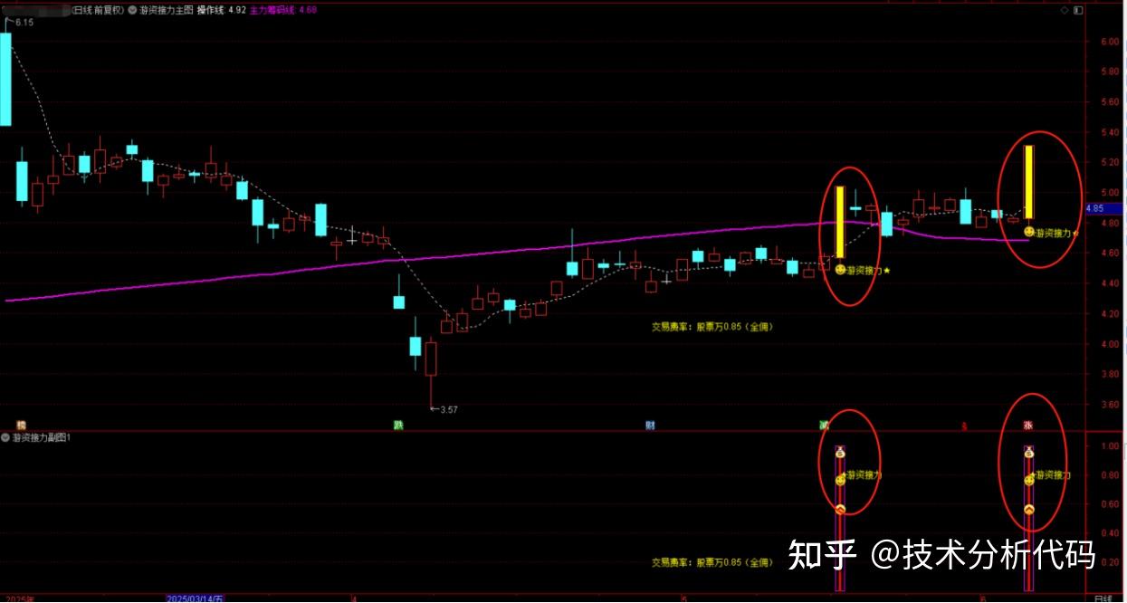 游资接力:=CROSS(游资筹码,擒龙筹码3) AND (游资筹码-REF(游资筹码,1))/REF(游资筹码,1) > 0.04 ;