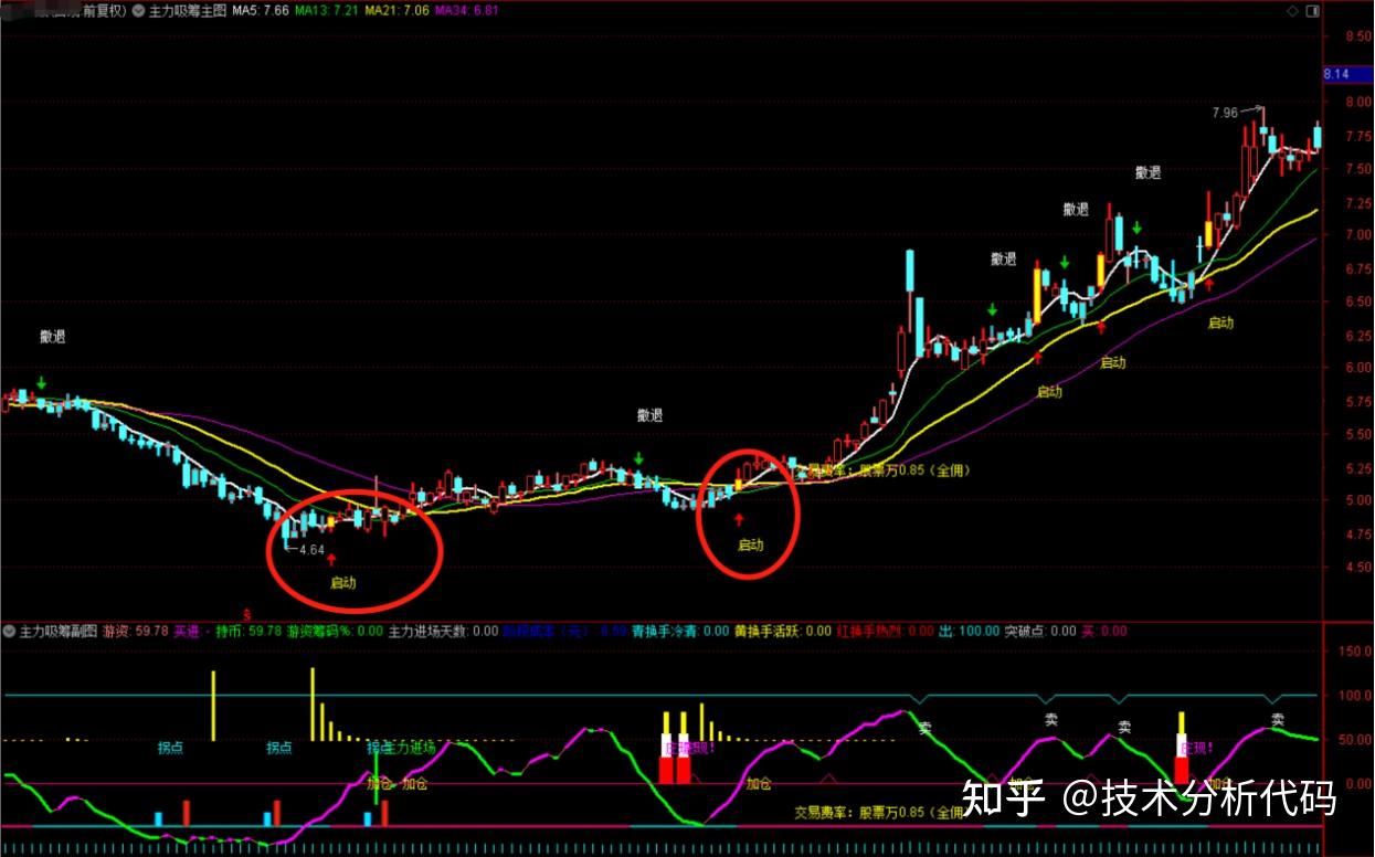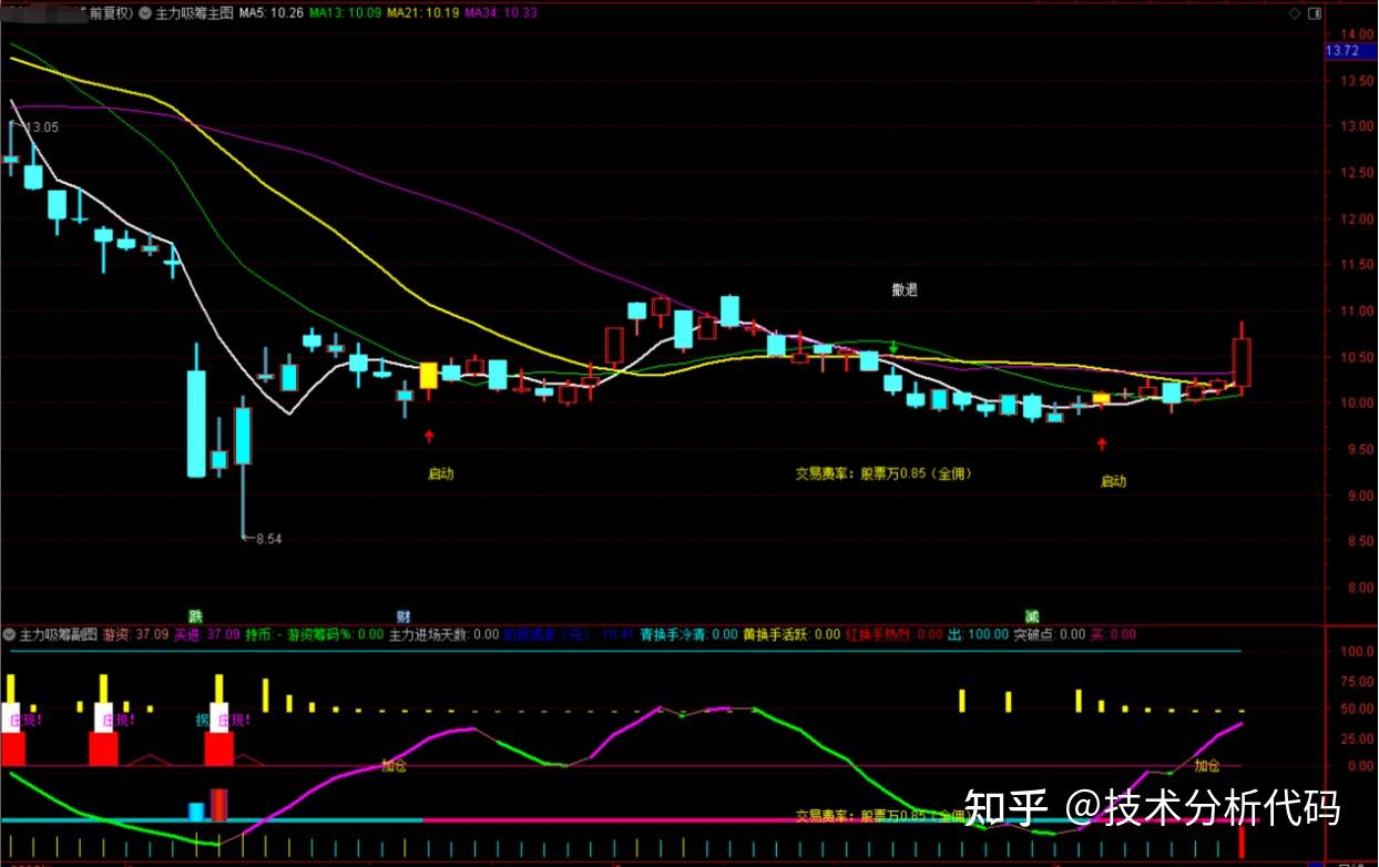 先有副图的拐点和吸筹预警,后有主图的启动信号。副图加仓信号是最后上车点。