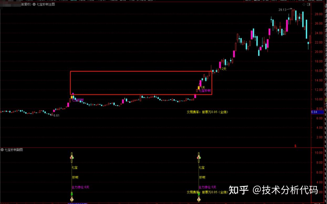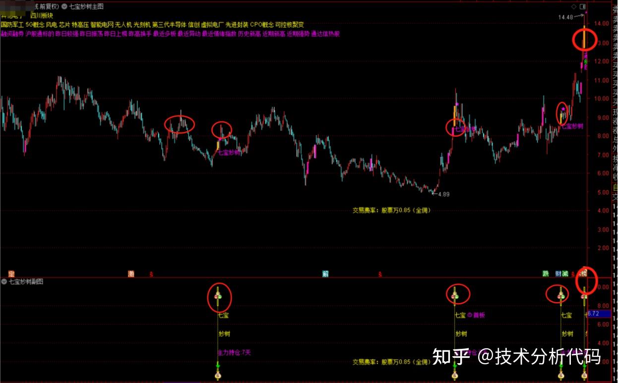 七宝妙树指标是一套监测主力机构持仓天数的指标,它包括了自动识别主力短期持仓天数、捕捉主力加速推高股价快速脱离成本启动信号等功能。这个指标能够根据当天的市场环境、大盘因素和板块因素,通过一套概率学运算自动判断当前出手的胜算率以及热点和风险,并在主图中实时显示。