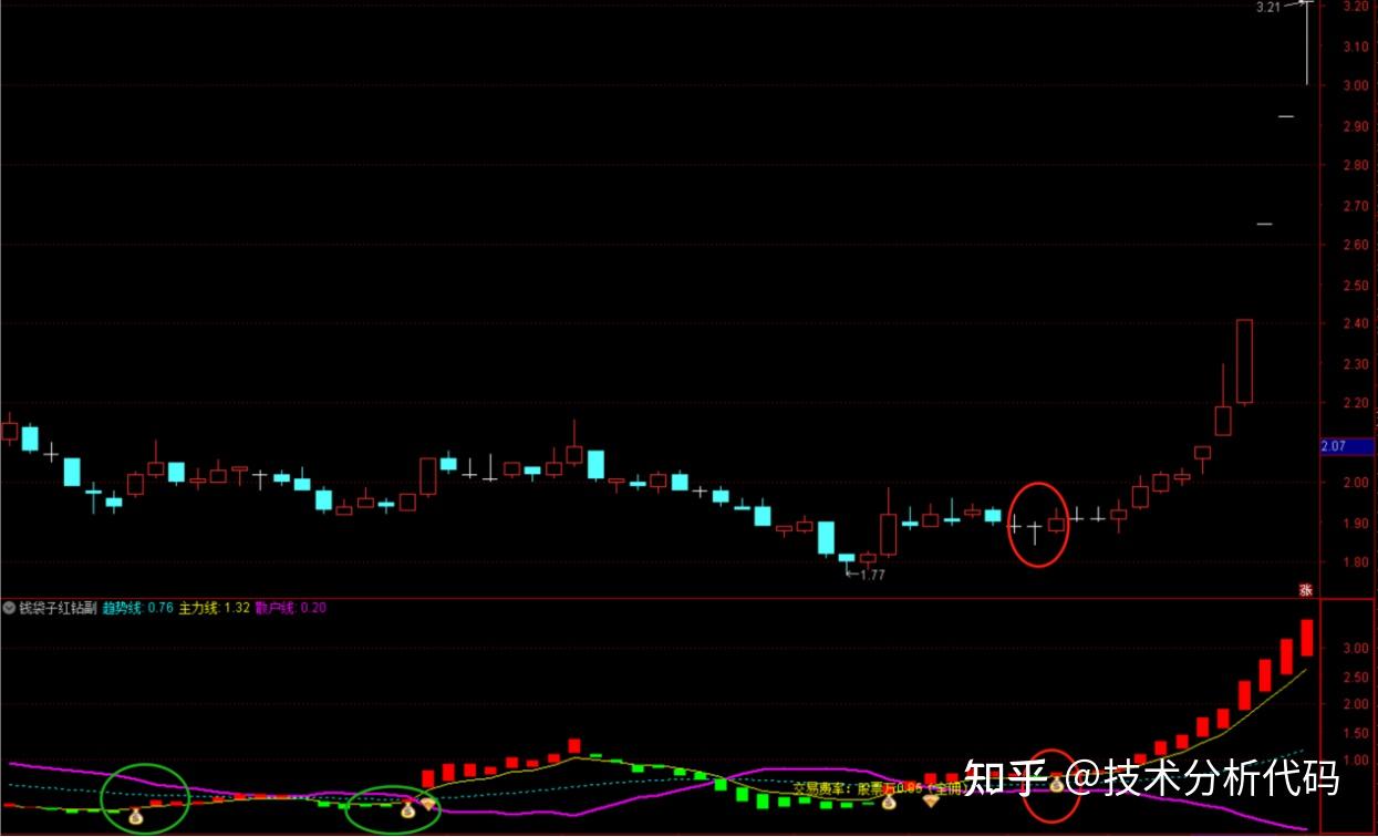 上图中出现红钻的地方,主力线向上穿越散户线,且前面红柱子越来越长。从股价来讲红色K线实体越来越长,同上图中第二次钱袋子时的K线实体长度恰好相反,如果后续股价突破前期平台,则需要高度重视此次机会。