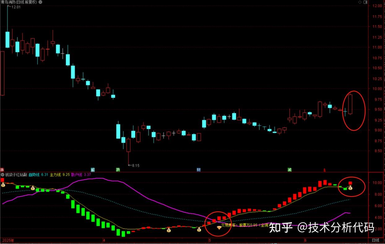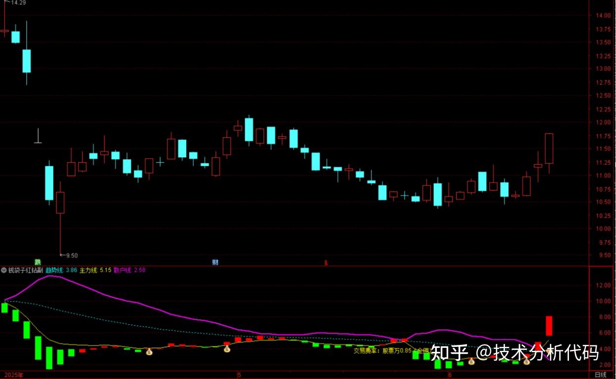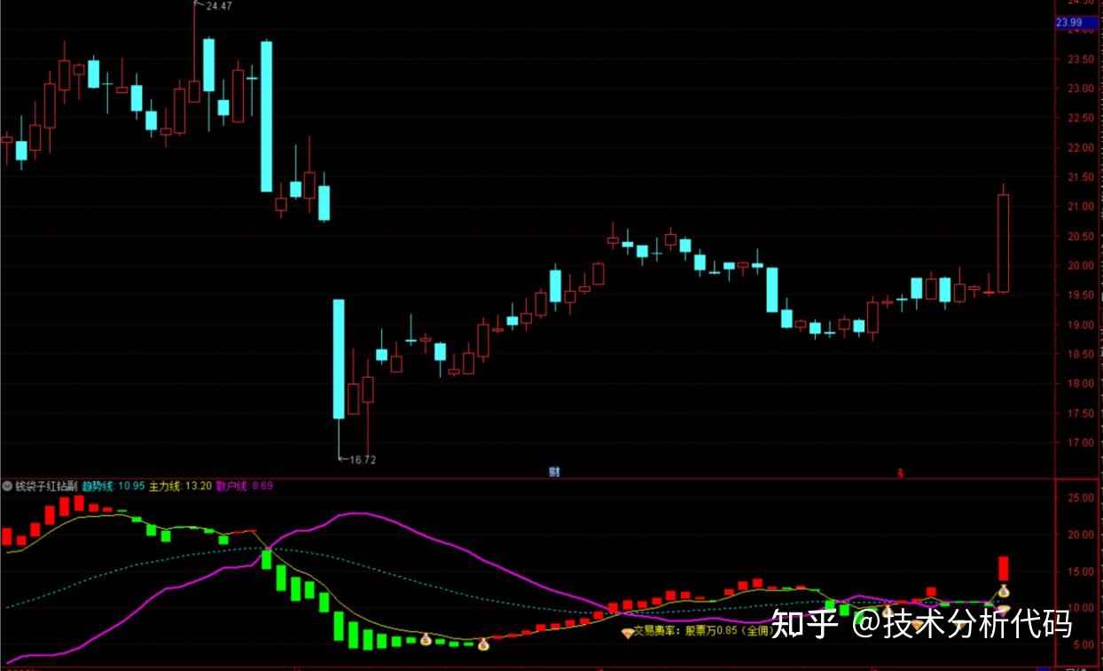 上图钱袋子出现与红钻之后,处于主力线上方,且处于趋势线上方。从股价走势看,股价经历一段震荡上行,具有一定向上的趋势,出现钱袋子时,股价以大阳线出现,本身具有看多信号,综合看来,本次钱袋子信号需要引起高度重视。