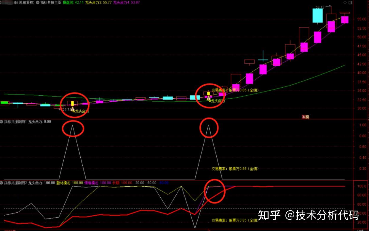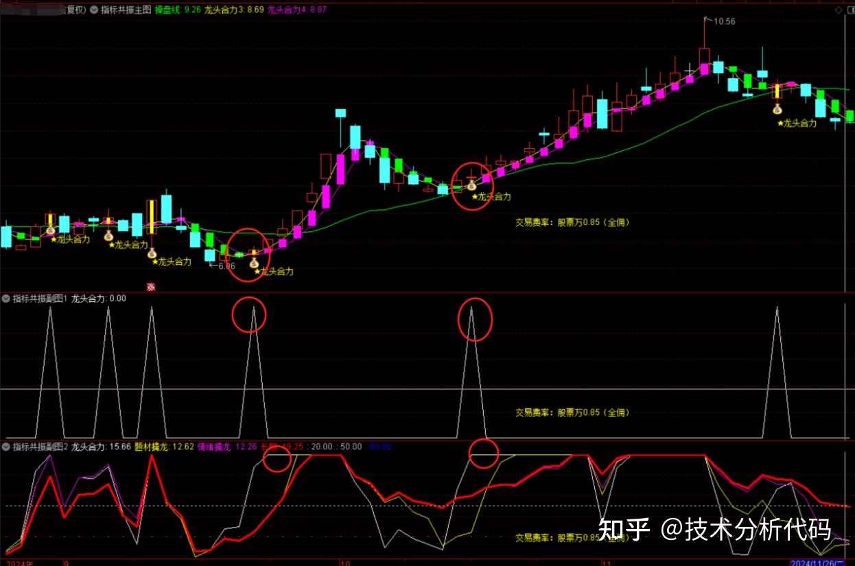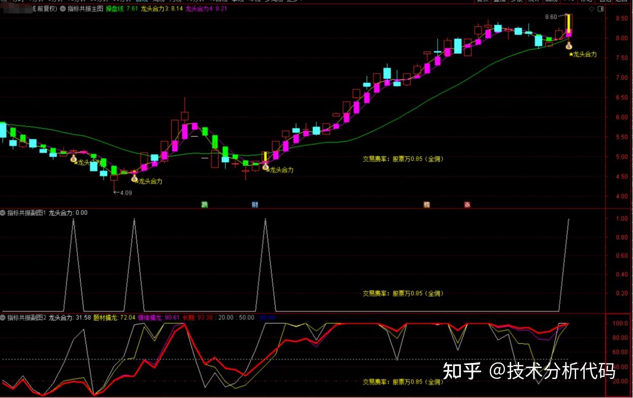 主图确定趋势和市场合力的买点,副图确定市场情绪,主线题材和支线题材之间的合力点出现。主图出现龙头合力信号后、副图三指标指标合一共振是确定性的买点。