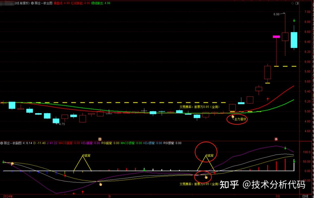 DRAWTEXT (拉升一号,L*0.97,'↖主力潜伏'),COLORYELLOW;