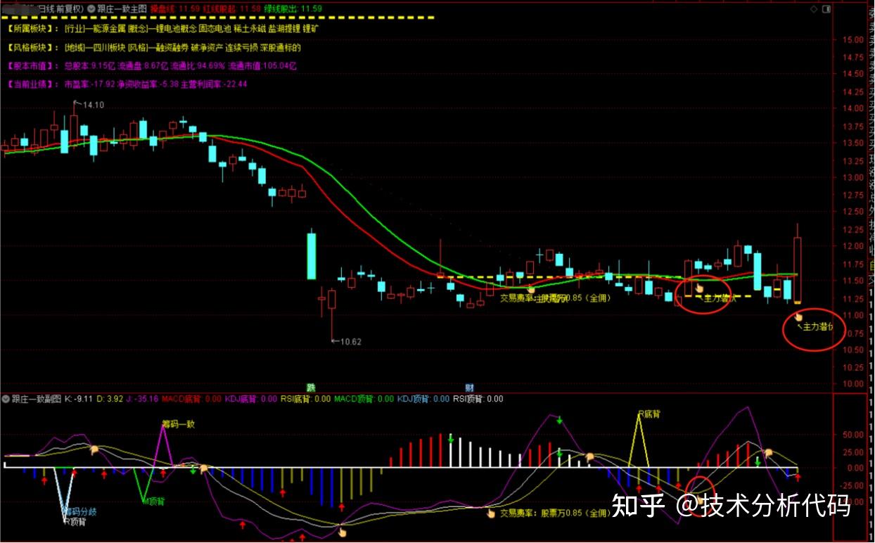 2.副图出现筹码一致信号,且主图出现主力潜伏信号,共振买点。
