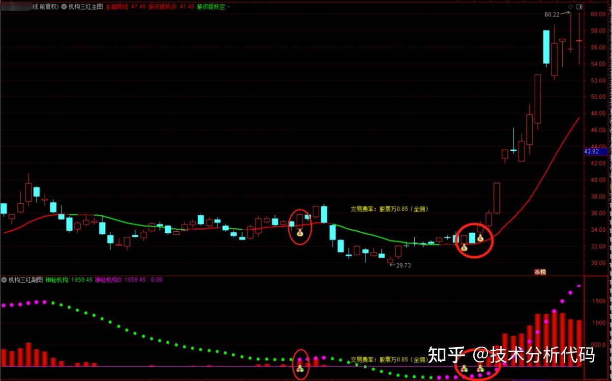 上图中第2次,第3次信号出现之前,主图中股价多日出现在红色线上方,副图中提前几日已经出现粉红色圆圈,最终股价从32元上涨至60元,股价也是快要接近翻倍了。