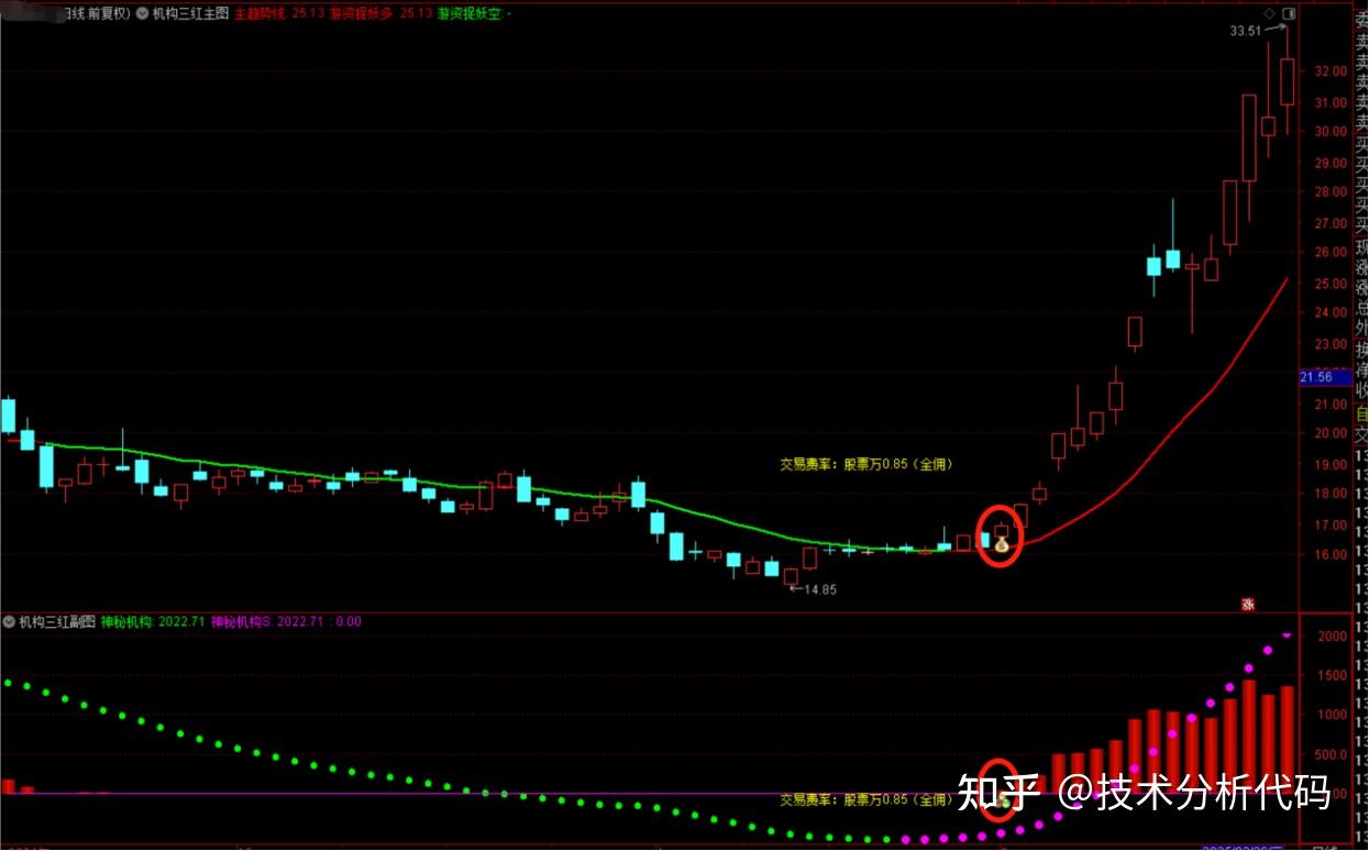 上图中满足主图红线,副图红柱子,副图中洋红色圆圈同时出现,而且在信号发出之前,主图中已经连续几个交易日股价站上主图红色线,同时副图中也是在信号出现之前几个交易日出现了红色圆圈。最终我们看见股价从17元左右上涨至32元,上涨了15元,几乎快要实现翻倍走势。