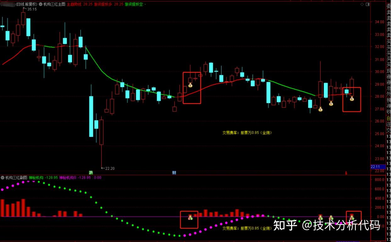 神秘机构三红指的是主图红线+副图红柱+副图洋红色圆圈,形成的游资主力共振买入信号,从买入到卖出的过程;用来监控游资主力的短期买和卖的信号;
