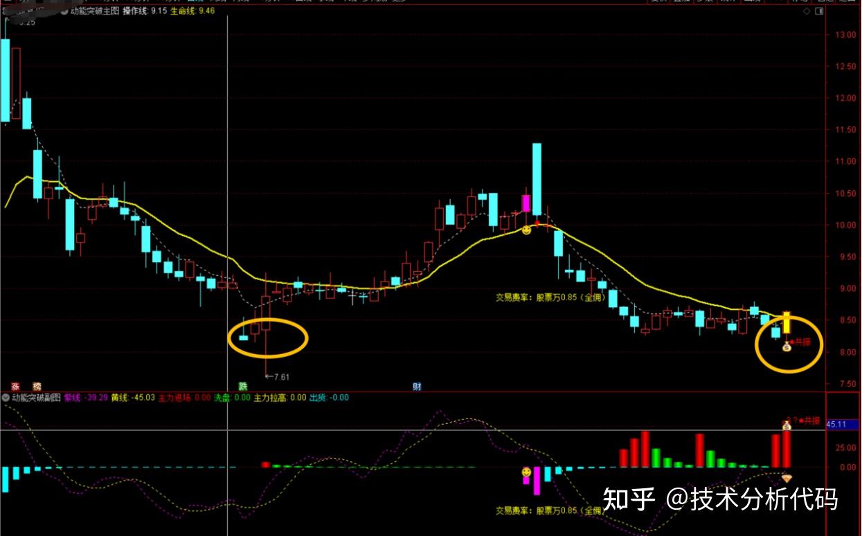 上图中,股价在前期低点附近发出了共振信号,但是在主图中股价并未完全站上生命线,因此,我们需要对该股的后续走势保持适当谨慎,如果后续股价能够有效站上生命线,那么后续走势就值得期待,否则,我们应该考虑短期放弃。