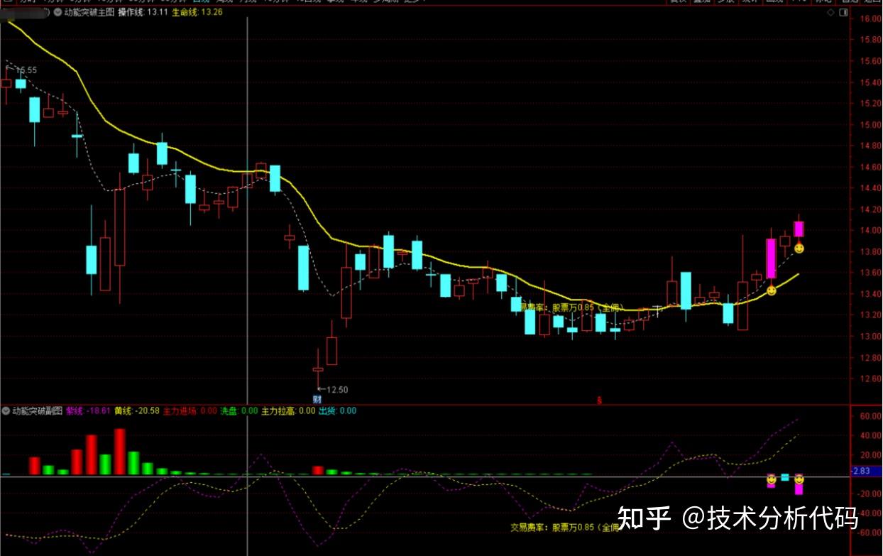 黄线:=MA(紫线,主力动能2),COLORYELLOW DOTLINE;
