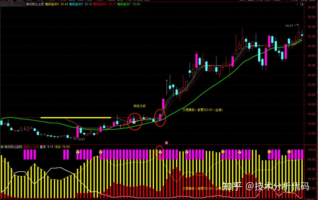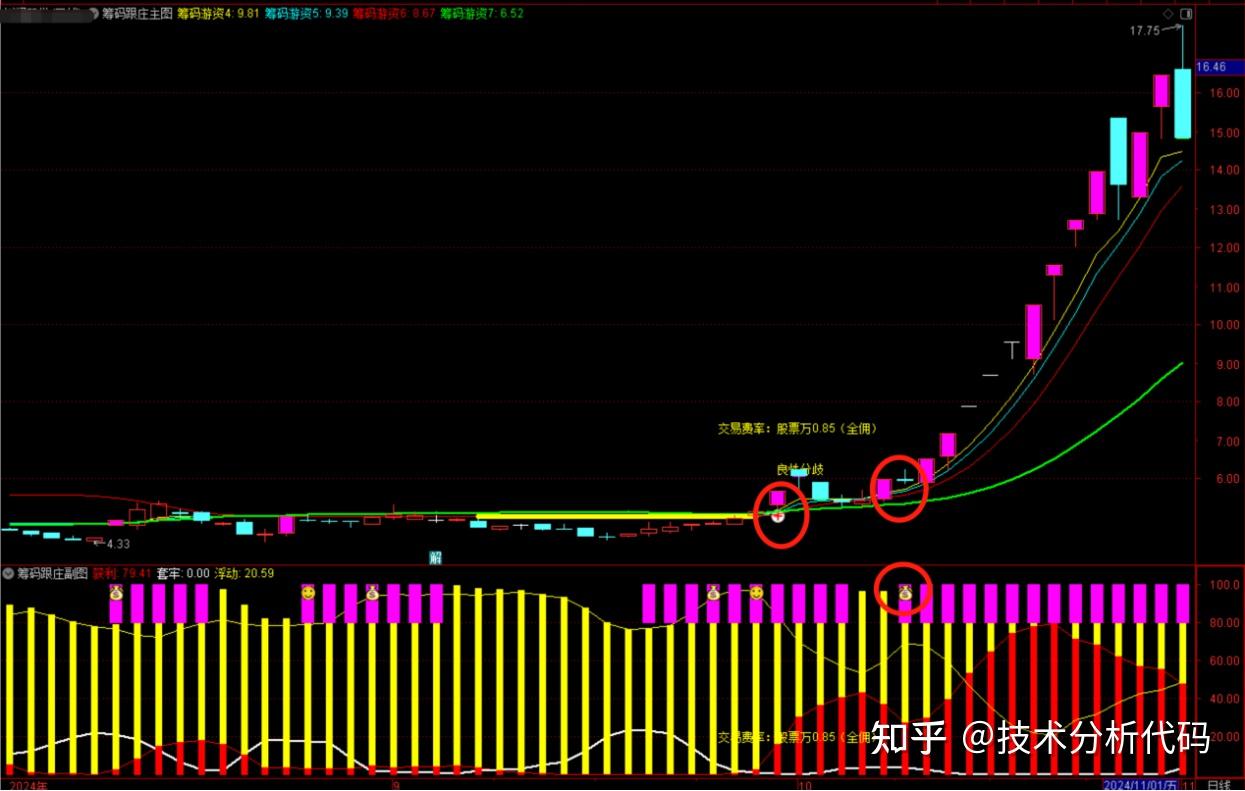 上图中发出了很多次信号,但是最后一次表现相当不错,股价从6元上涨至17元,涨幅接近2倍。各位仔细观察会发现,前几次信号出现时,股价均为站上筹码线,因此信号较弱。