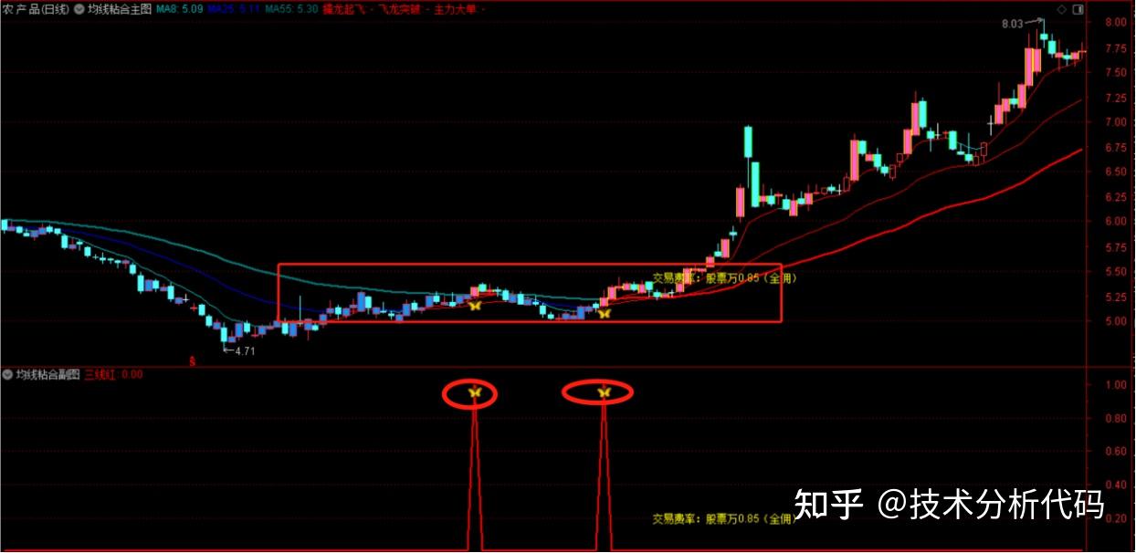 上图中第一次信号以失败告终,第二次信号出现之后股价出现了超过60%的上涨,信号出现是观察的起点,信号出现之后,我们还需要结合其他技术图形进行综合分析,如果信号出现之后,股价跌破主图中粗红色线条则需要考虑止损。