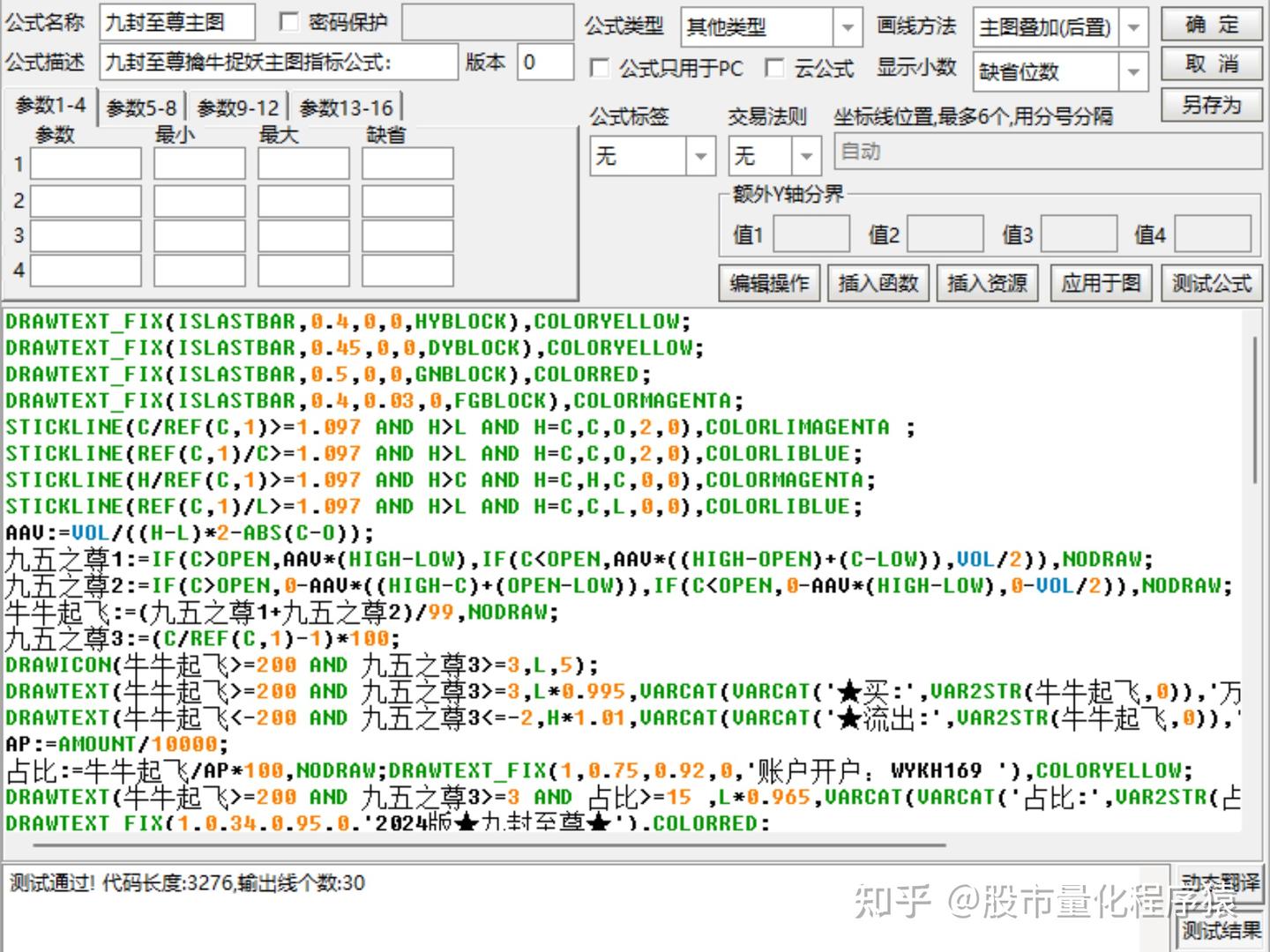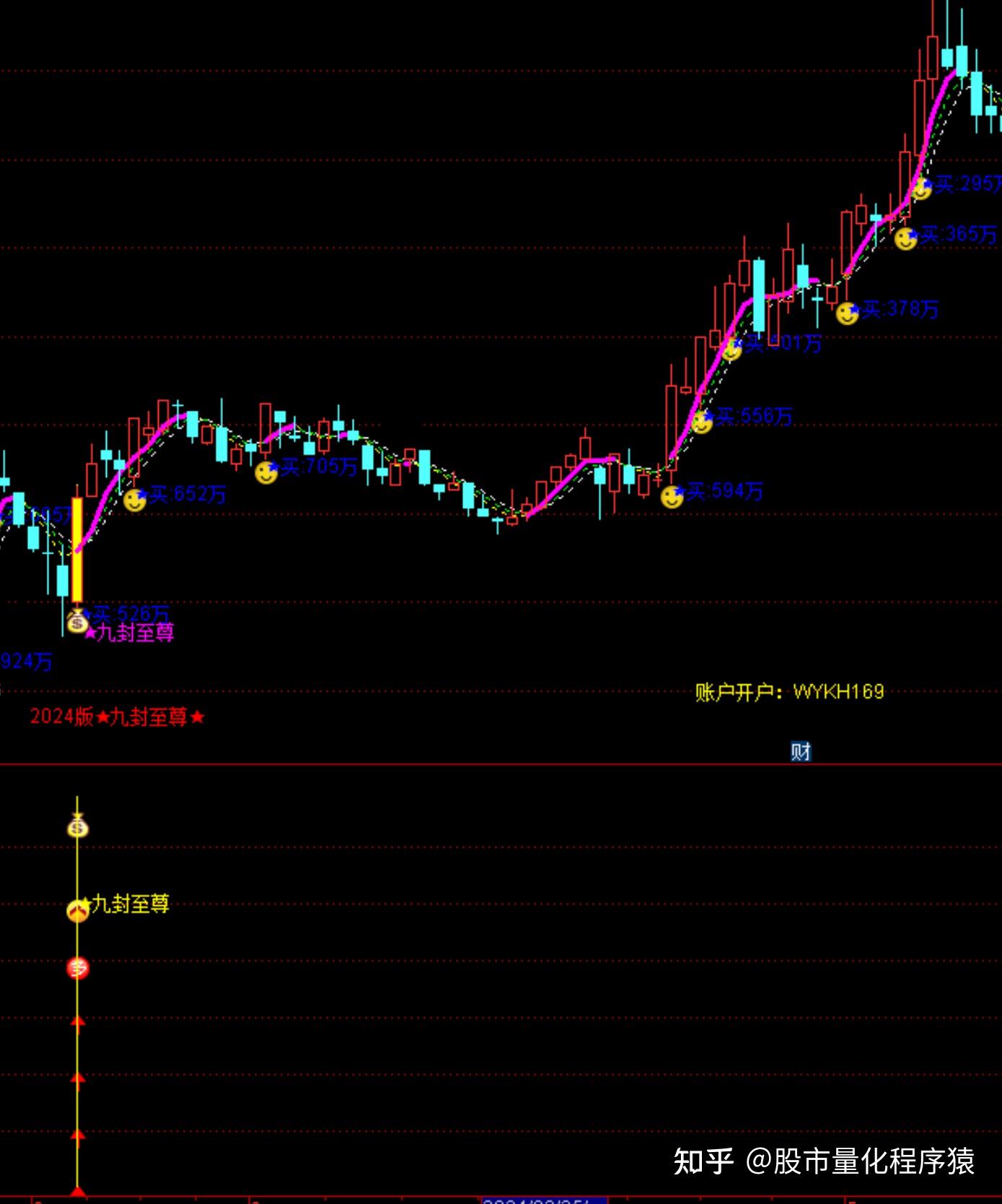 Posted in量化公式 指标公式第84篇:九封至尊抓牛指标 2025-11-09No CommentsPosted in量化公式 包含九封主图+九封副图+“笑脸”信号选股+“钱袋子”信号选股预警。 其中净买入显示“笑脸”信号,此信号可选股。 九封至尊显示“钱袋子信号,此信号可盘中预警或尾盘选股使用。 股价在洋红色持股线上运行时-持有; 股价在三条虚线颜色下运行时–空仓。 九封至尊抓牛主图指标公式: 九封至尊抓牛副图指标公式代码: 没有哪一个指标能够让参与者一本万利,一劳永逸,“九封至尊抓牛指标”亦是如此,希望能够对参与者有所启发。如需要沟通可以留言私信(源码)。 – Post navigation Previous Post 指标公式第83篇:涨停突破之龙腾抓牛抓中短线主升浪指标Next Post指标公式第85篇:分时放量突破抓涨停指标