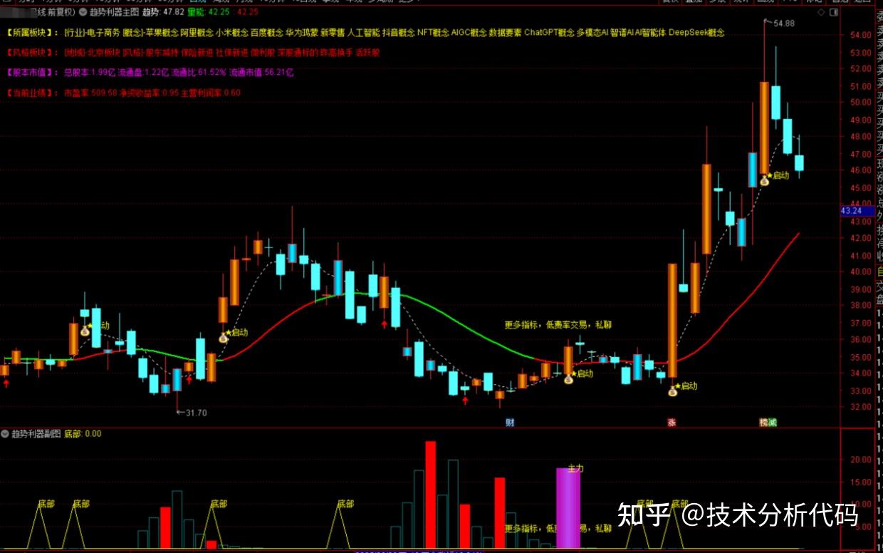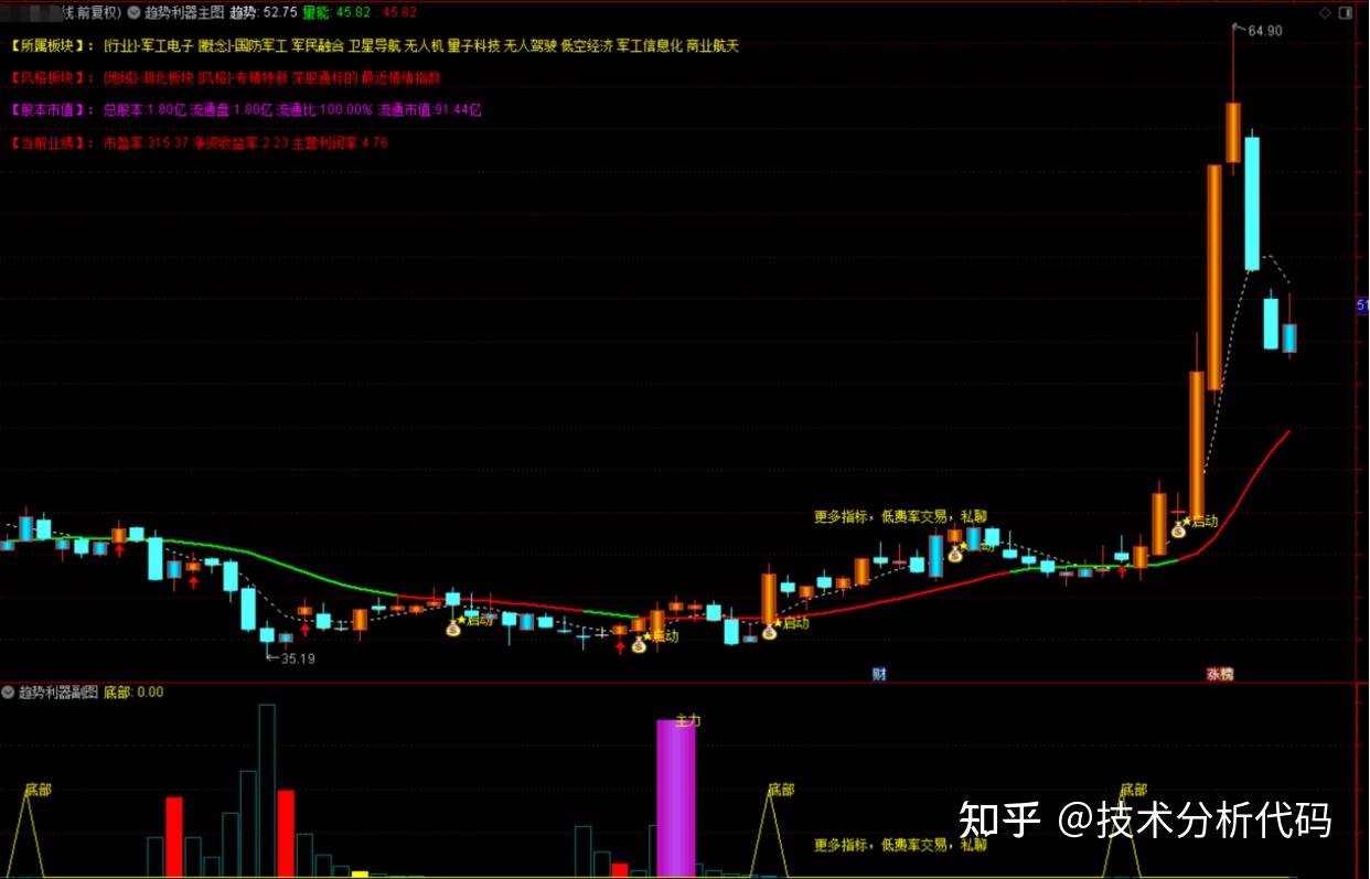 量能:IF(1,SMA(趋势,8,1),DRAWNULL),COLORGREEN,LINETHICK2;