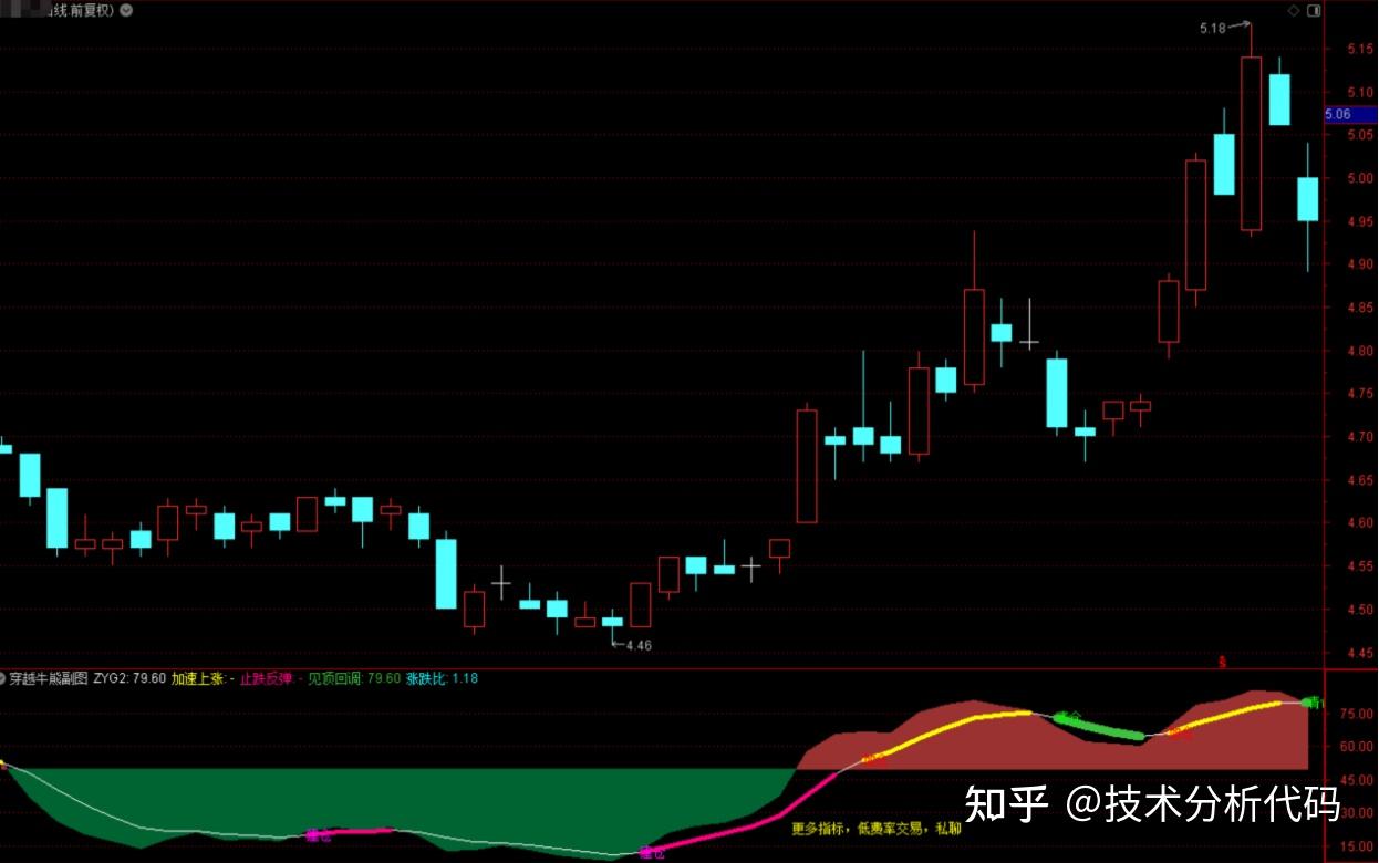 下跌趋势:=IF(ZYG1< 50,ZYG1,DRAWNULL),COLORGREEN;