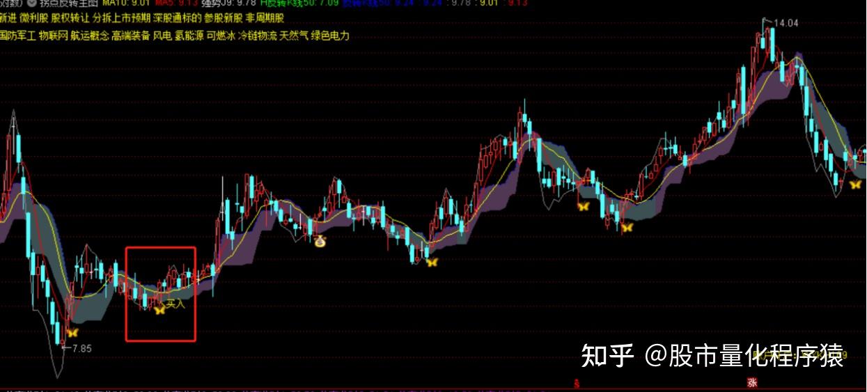 DRAWICON(跟庄介入 AND 强势J34>=(HHV(H,34)+LLV(L,34))/2,反转K线20,9);