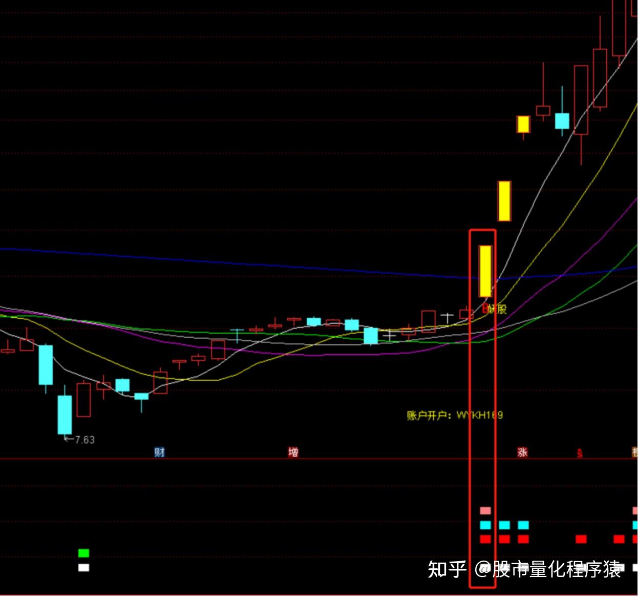 突破涨停:=IF(CROSS(C,A) AND ZT>0,-4,0),COLORYELLOW;