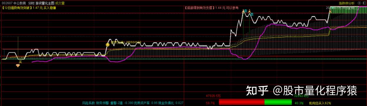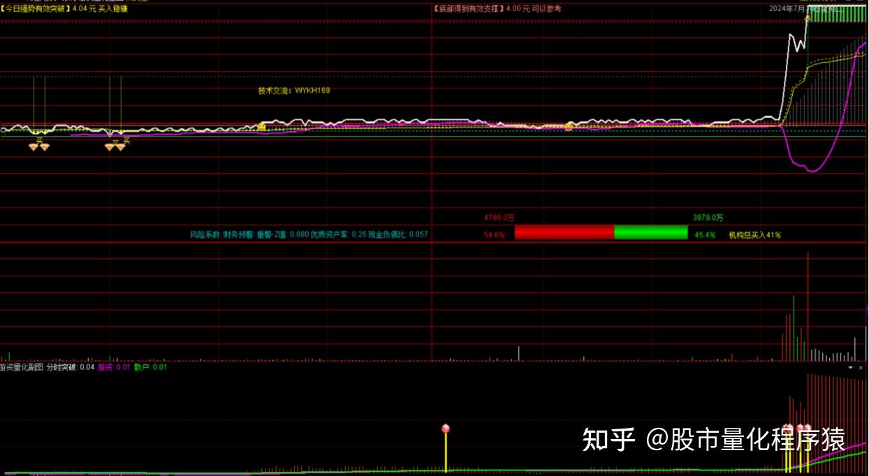 指标说明:量化分时指标,包含入场位提示,统计机构和散户的买卖占比等信息,分析散户和机构的买卖力道,帮助投资者判断个股目前是由机构主导还是散户主导。同时,还可以确定突破买入的价位,帮助您把握买入后的上涨概率。