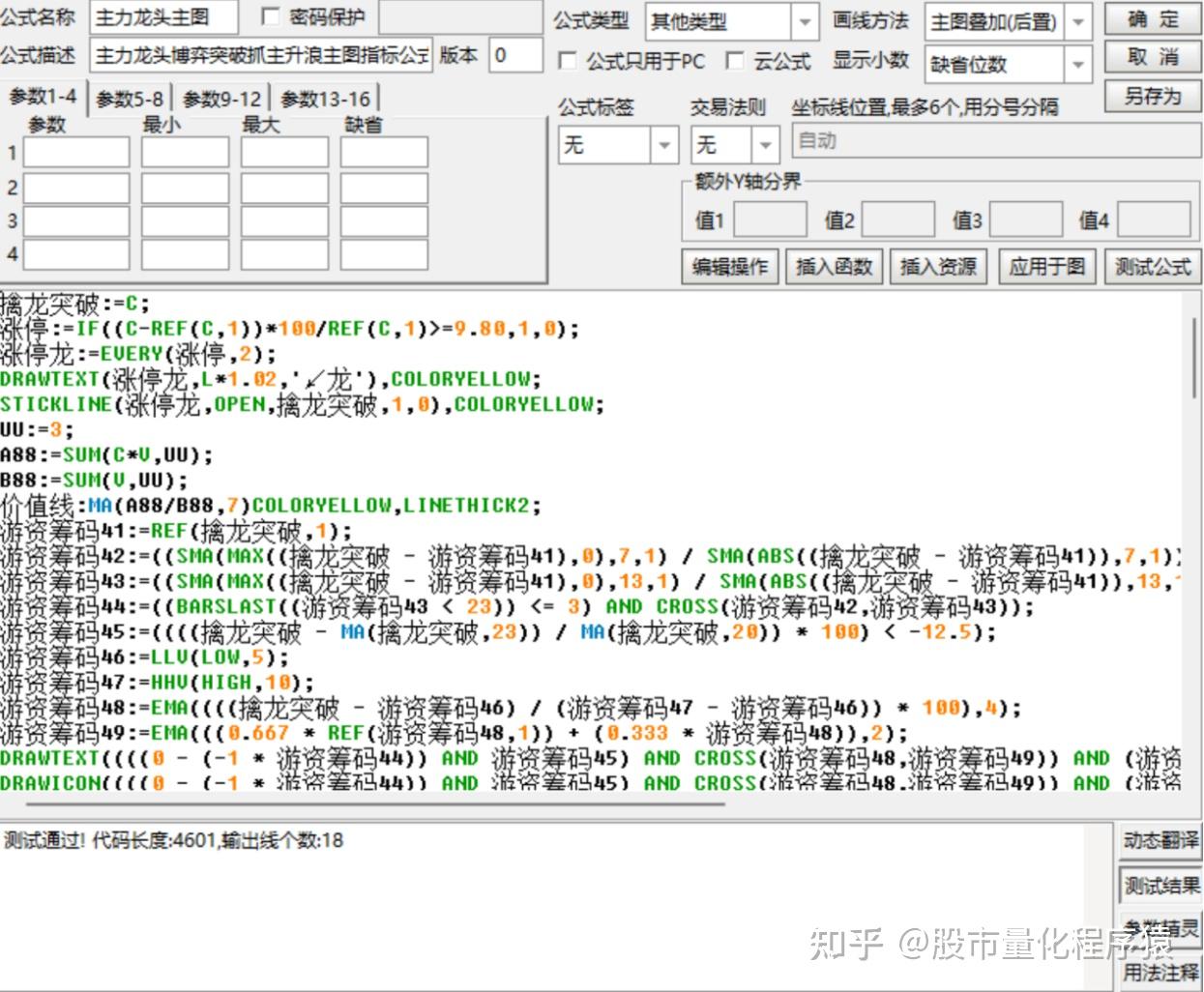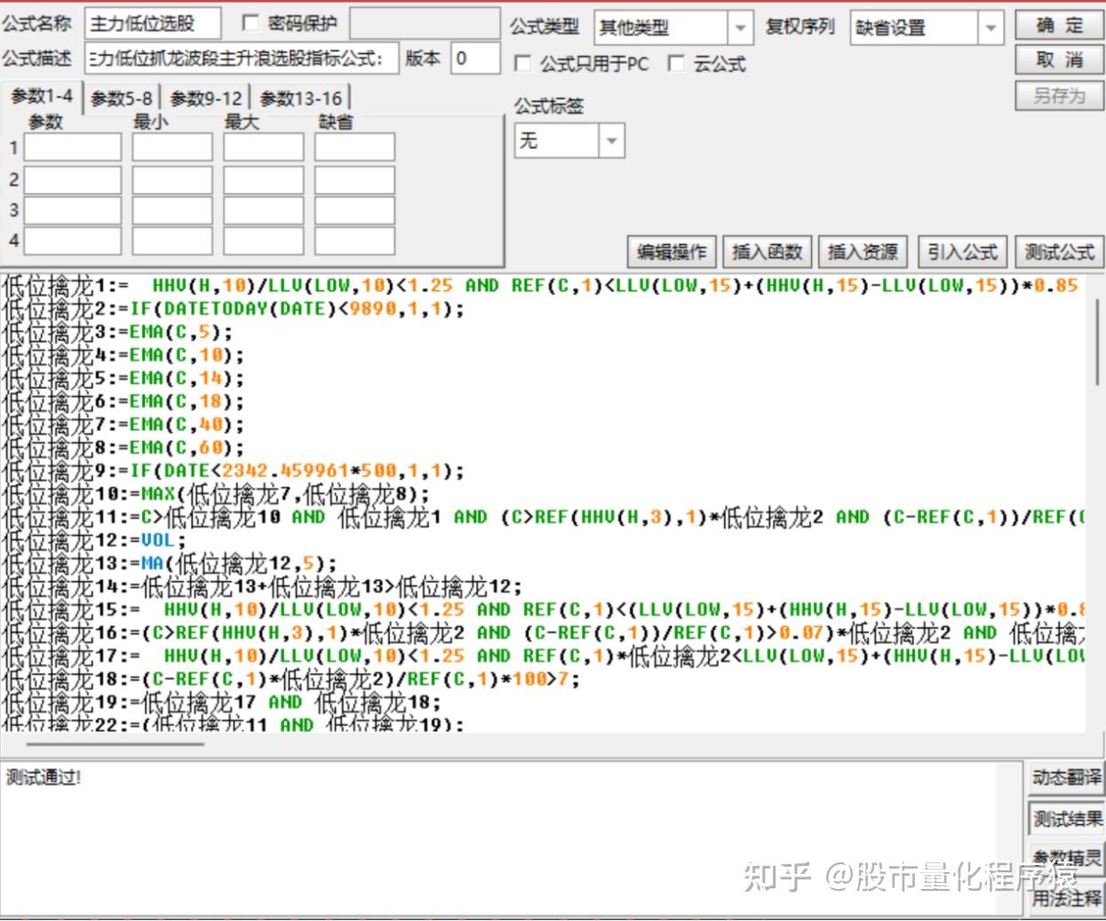 低位擒龙15:= HHV(H,10)/LLV(LOW,10)<1.25 AND REF(C,1)<(LLV(LOW,15)+(HHV(H,15)-LLV(LOW,15))*0.85)*低位擒龙2 AND C>OPEN AND C>=HHV(H,10)*低位擒龙9;