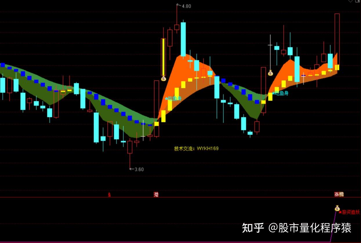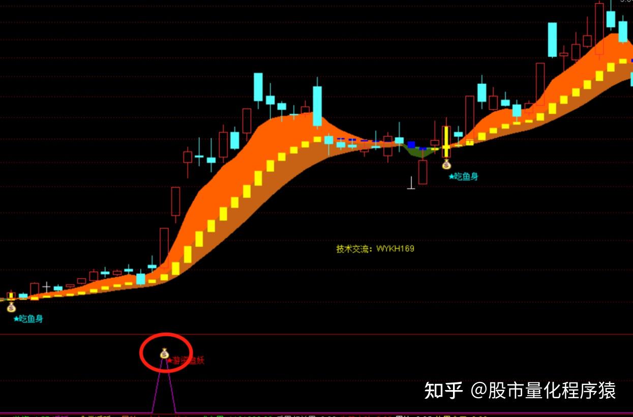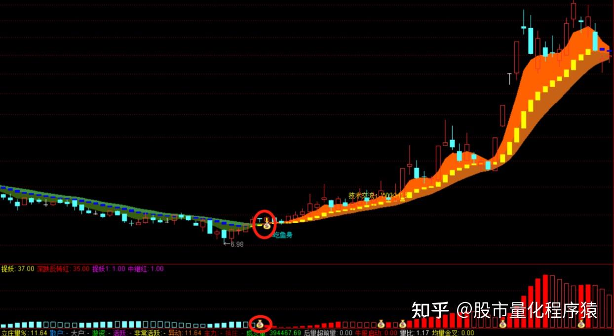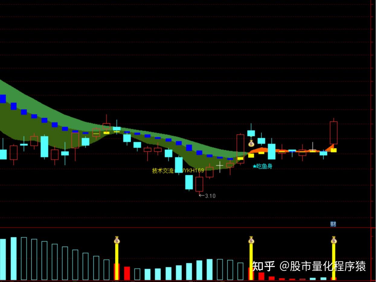 鱼头鱼尾行情都不参与是本指标的宗旨。所以买点逻辑是主图出现吃鱼身信号和副图出现钱袋子图标。
